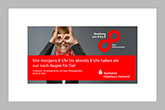 So lässt sich die Kampagne augenfällig von 8 bis 8 pushen, und anschließend kann die grafische 8 als Einzelelement in anderen Motiven dargestellt werden. Seit dem 2. Dezember werden die neuen Beratungs- und Öffnungszeiten über die 75 Filialen per Poster, Flyer und Kalender direkt den Kunden vermittelt. Außerdem zeigen Geldautomaten und Internet diese Kampagne.