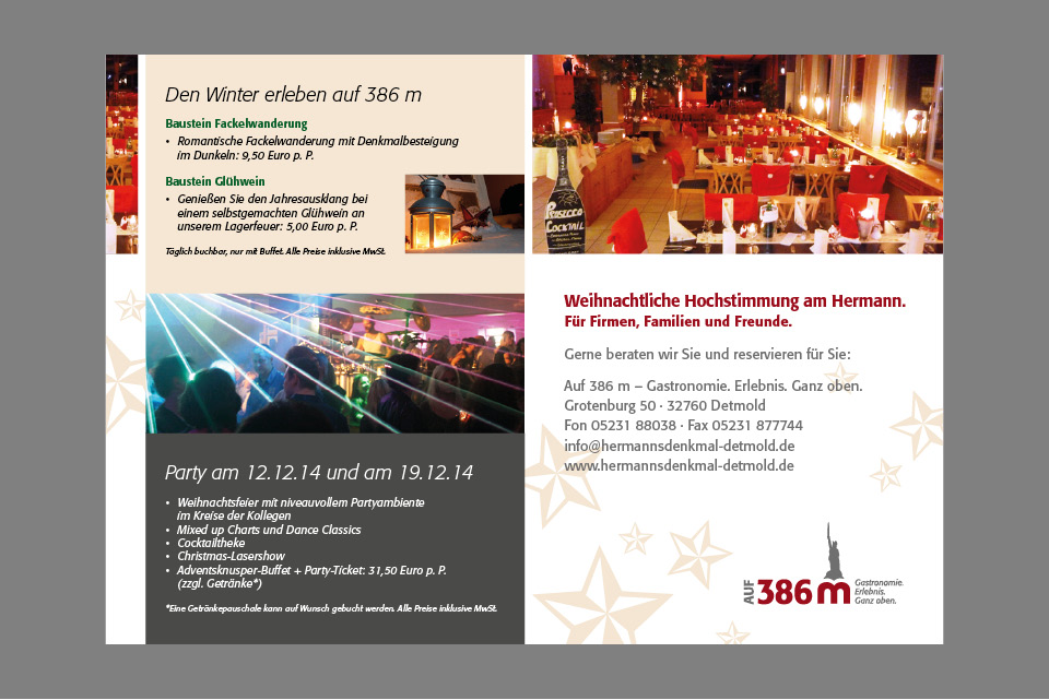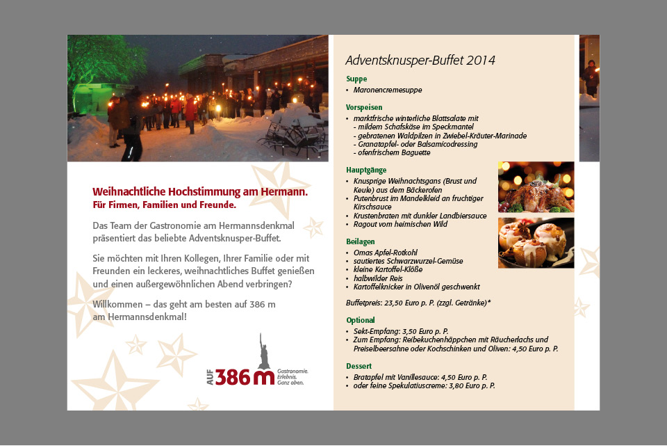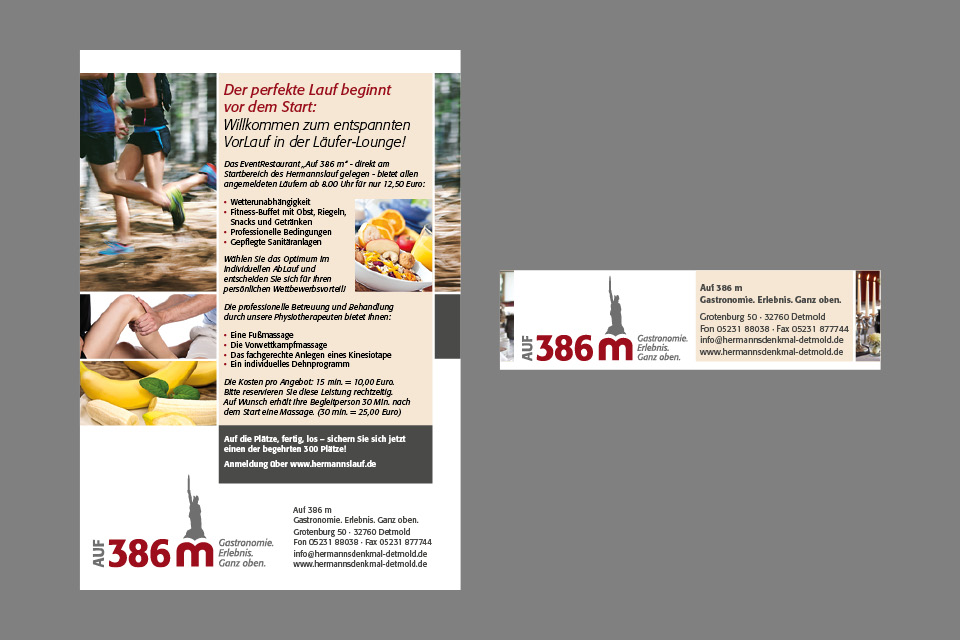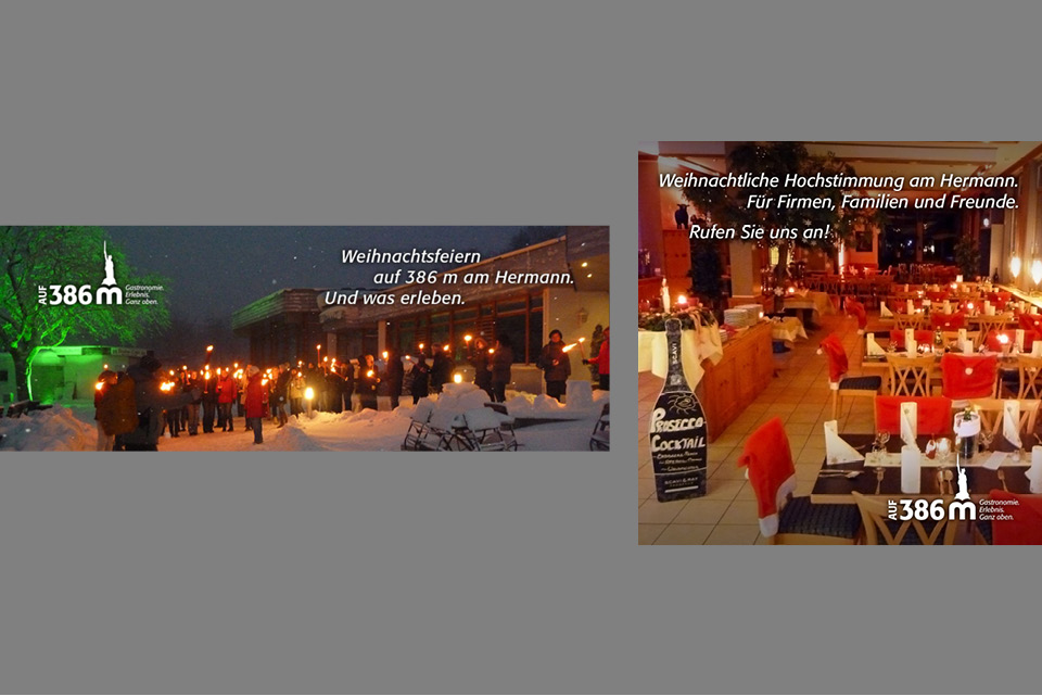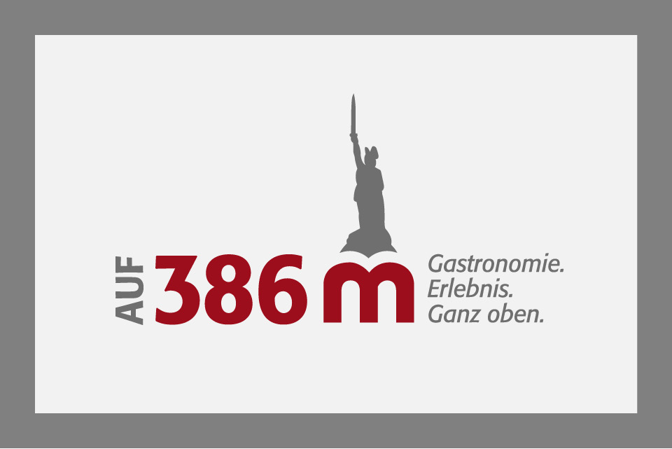 10.2014. Nicht nur für Gipfelstürmer ist da etwas Tolles entstanden: Auf 386 m steht bekannterweise der Hermann als Alleinstellungsmerkmal und damit: über den Dingen. Doch auch die Erlebnisgastronomie Auf 386 m um Inhaber Guido Röcken und das Teuto-Gastro-Team ist ganz oben angekommen. Nun geht Herr Röcken den nächsten Schritt mit uns: ein entsprechendes Logo und eine kleinere Namenskorrektur. Dass dabei der Hermann Berücksichtigung finden musste, versteht sich von selbst. Und im Zuge dessen ließen wir auch schnell Facebook-Teaser, einen Flyer und ein Poster entstehen. Falls Sie fragen, wo der schönste Ausblick auf Detmold liegt: Auf 386 m.
