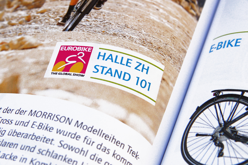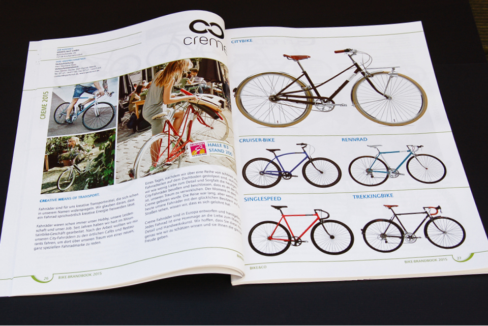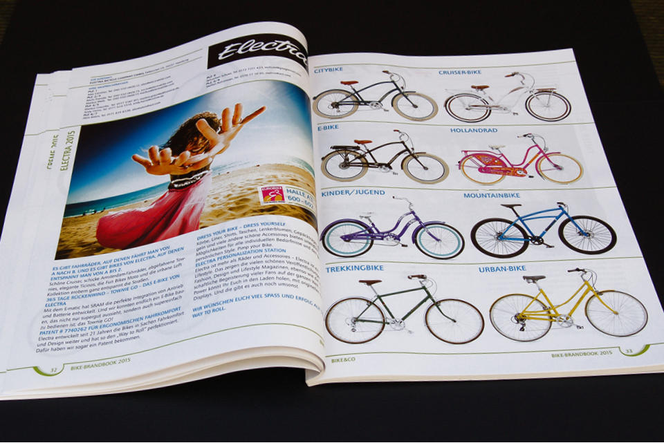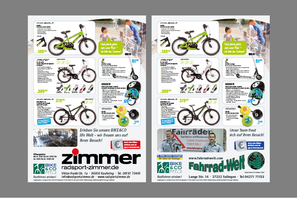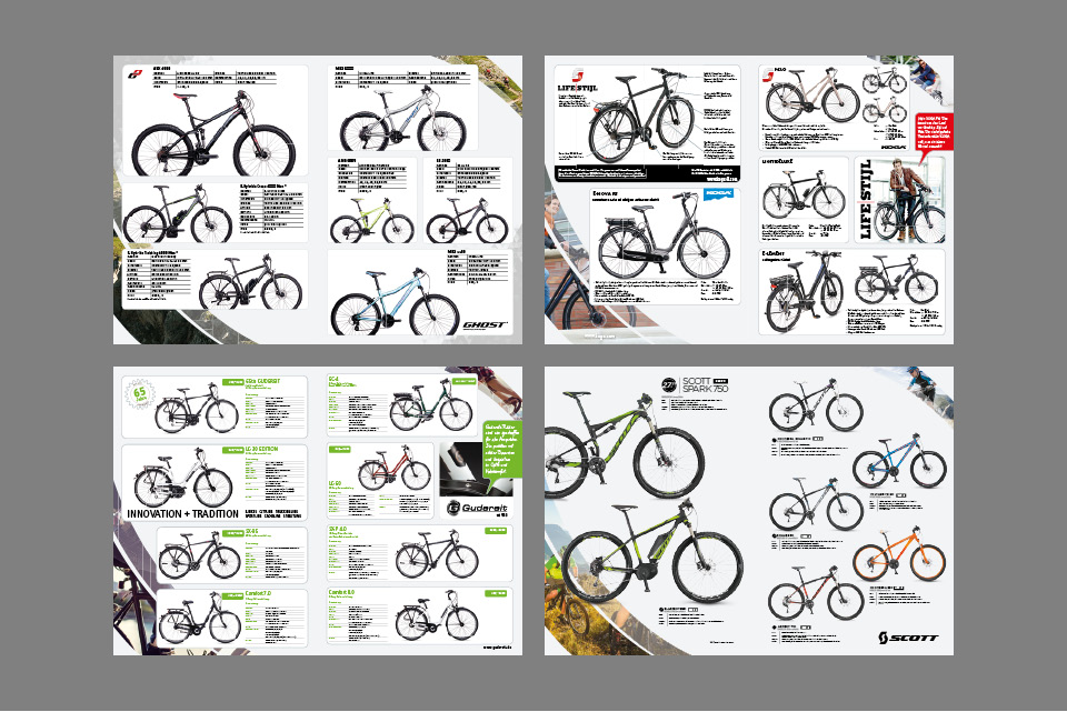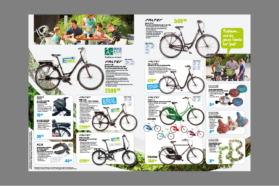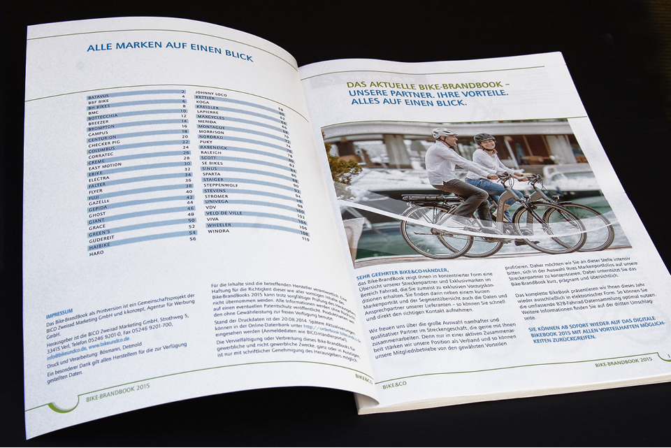 Der 8-seitige Prospekt im DIN A3 Format hatte neben attraktiven Produkten auch noch Individualisierungen für den Fahrradhändler parat: Nicht nur Firmeneindruck, sondern auch Fotos wurden integriert, außerdem konnte er eine Doppelseite mit Fahrradmarken seiner Wahl präsentieren.