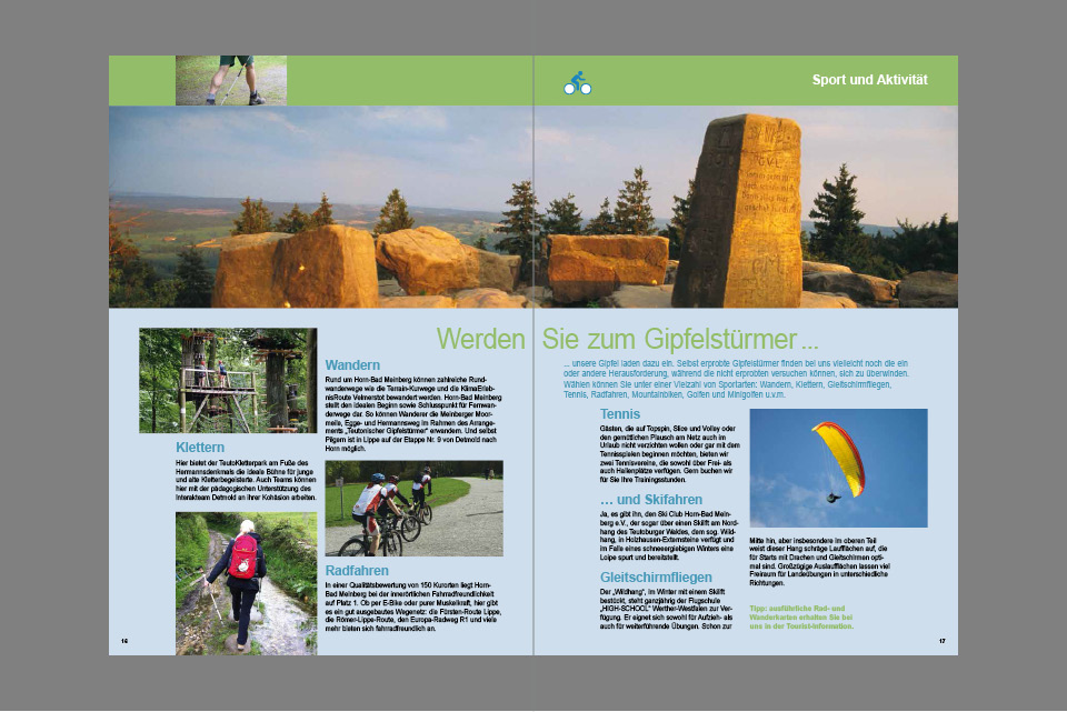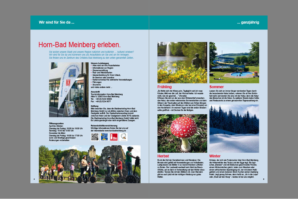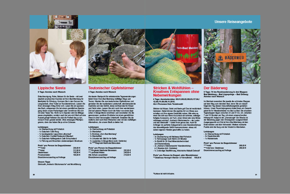 11.2014. Was lange währt wird wieder gut. Seit vielen Jahren arbeiten die Stadtmarketing Horn-Bad Meinberg GmbH und die Gastgeber mit den k-konzeptlern gut und erfolgreich zusammen. Das hat sich auch mit der jetzigen Geschäftsführerin erneut bestätigt. Das Resultat ist ein neues Reisemagazin, das den bisherigen Reisekatalog und Gastgeberkatalog ablöst. Konstruktiv, reibungsfrei und lippisch-effektiv entstand das 52-seitige Tourismuswerk. Komplett made in Lippe will das Reisemagazin 2015 „natürlich gut ankommen“ und geht für Horn-Bad Meinberg bereits Anfang November auf Gästefang. Der frühe Vogel…