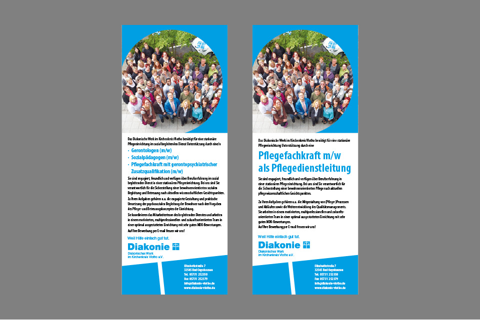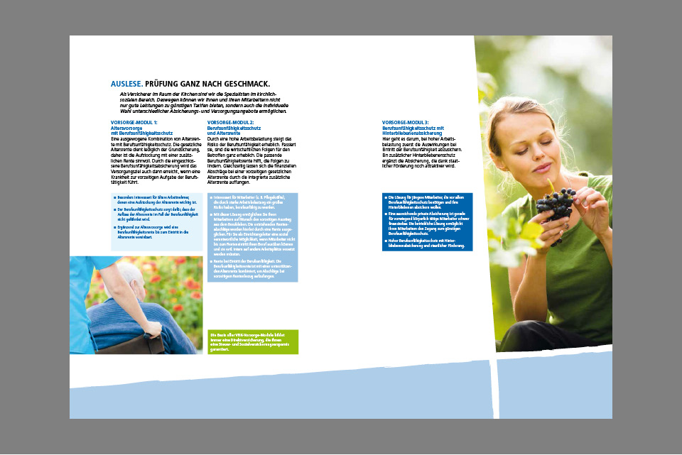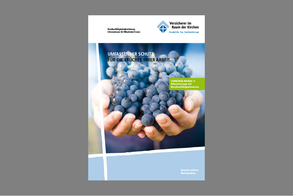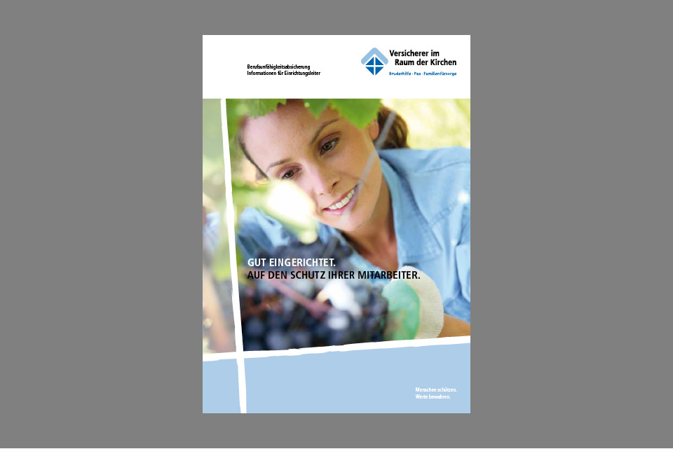 Es geht um die Berufsunfähigkeitsabsicherungen für gesamte Einrichtungen, Führungskräfte und Mitarbeiter im sozialen und kirchlichen Bereich. Die Broschüre für den Einrichtungsleiter informiert über alle Möglichkeiten und Vorteile. Für die Mitarbeiter gibt es drei Broschüren, die nach entsprechenden Versorgungsmodulen aufgebaut sind.