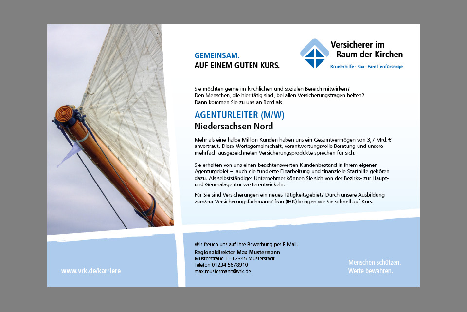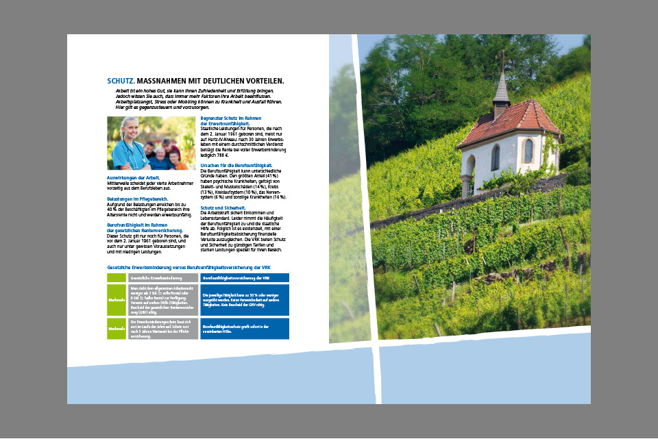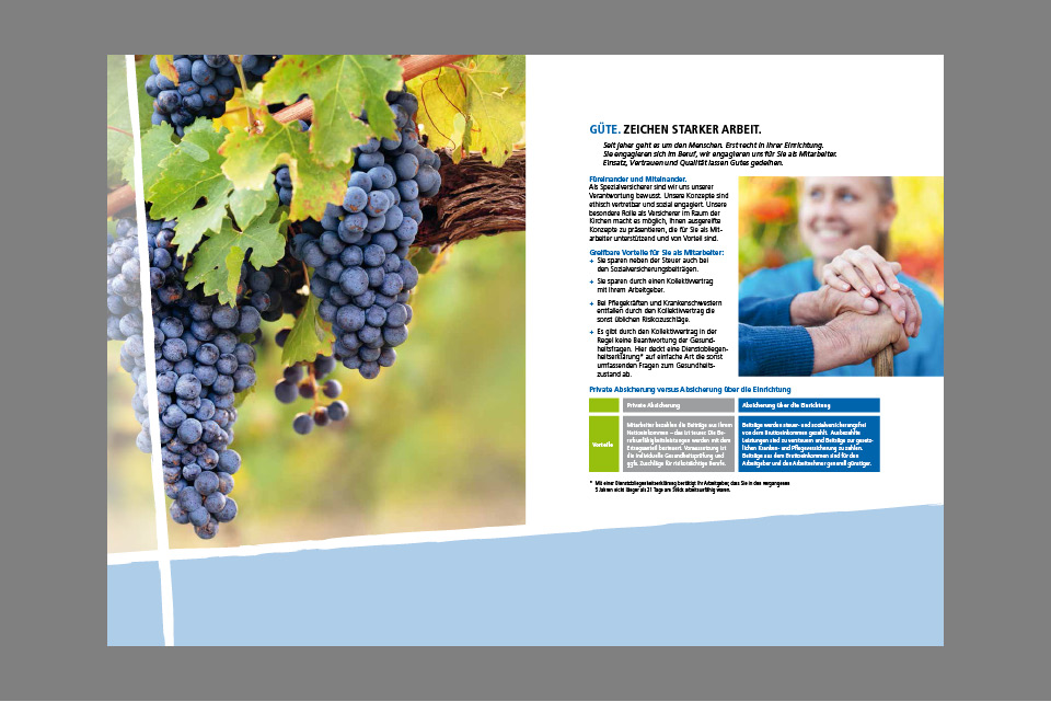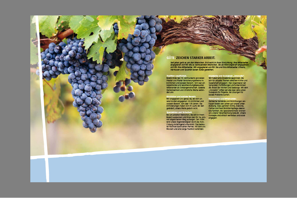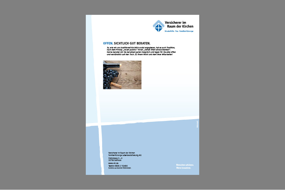 08.2014. Unser Kunde, die Versicherer im Raum der Kirchen (VRK), hat eine lange Tradition, ebenso das Prinzip des „coram publico“. Hier schenkt der kultivierte Gastgeber vor den Augen des Publikums Wein ein. Die Idee der k-konzeptler rankt sich um den Wein. Ausdrucksstarke natürliche Fotoaufnahmen in Verbindung mit Headlines, welche die Motive und die Themen der Broschüren aufnehmen. Alles im CD und Wording, das die k-konzeptler ebenfalls ausgearbeitet haben.
