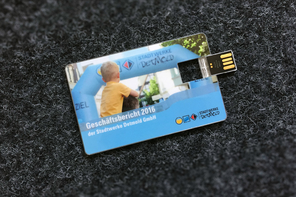 Die k-konzeptler haben auf Wunsch des Kunden auf die klassisch gedruckte Version des 36-seitigen Werkes verzichtet und es auf eine 4 GB Wafer-USB-Card gebracht. Diese ist in eine DIN A4 Mappe eingeklebt. Auch ein handlicher Flyer mit dem Zahlenspiegel steckt in einer transparenten Ecktasche der Mappe. Die wichtigsten Kennzahlen sind hier aufgeführt. Generell wurde an Material gespart, aber nicht an der aussagefähigen Bilanz des Unternehmens. Und auch der USB-Stick lässt sich weiter verwenden. Starke Zahlen – starker Auftritt! Und auch für die Zusammenarbeit gilt der von den k-konzeptlern vor einigen Jahren entwickelte Slogan für die Stadtwerke Detmold: „Service mit Energie“.