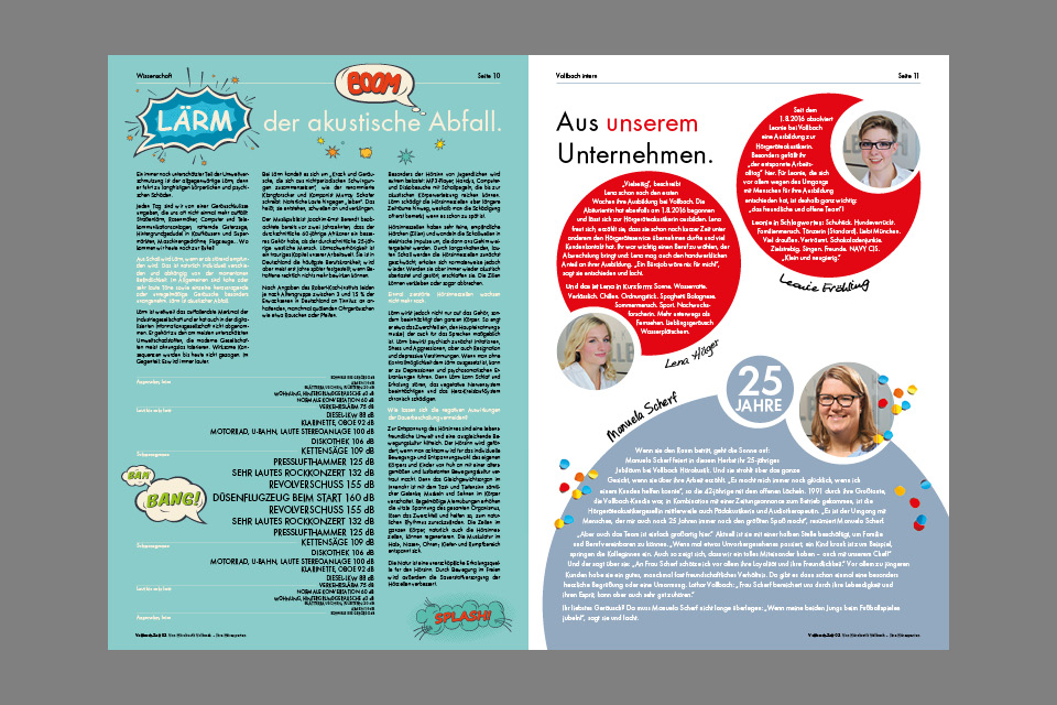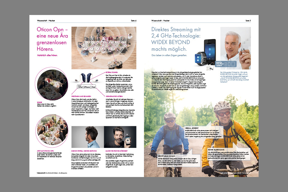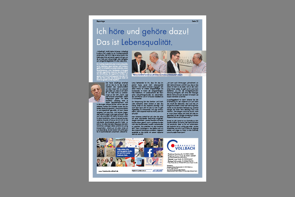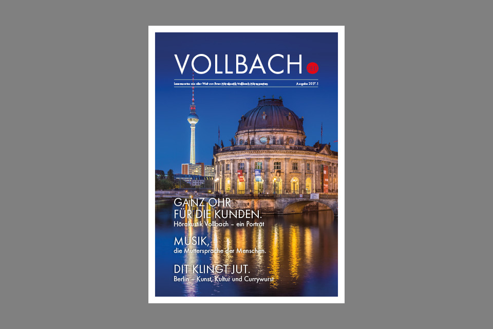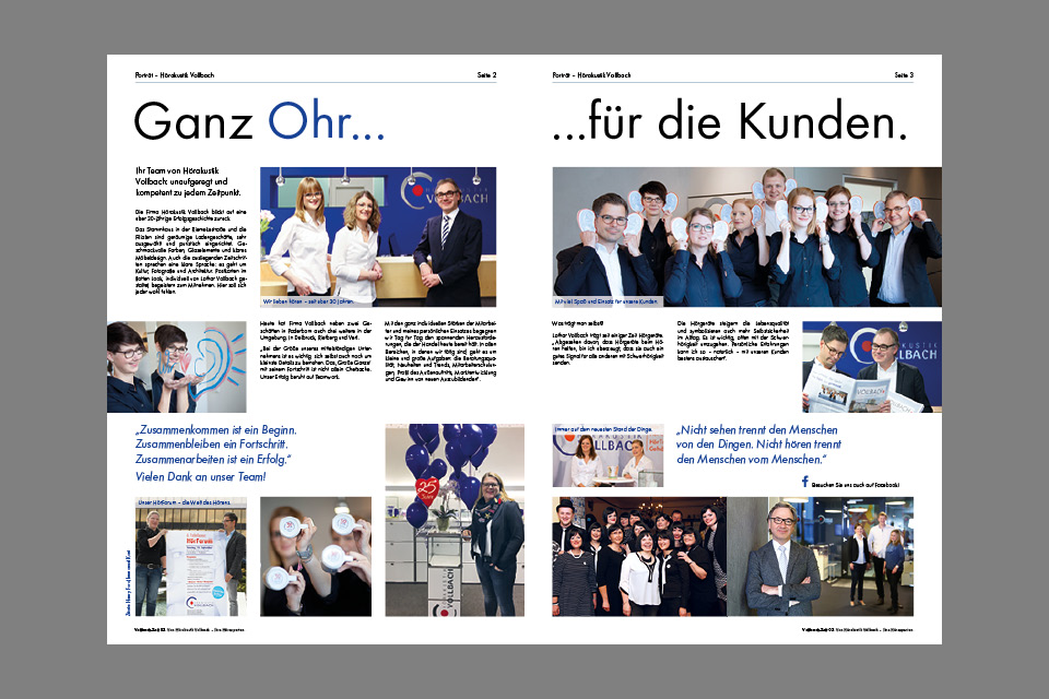 Mit einem Magazin übers Hören: zum Anfassen, Sehen und Lesen. Und auf diese Weise bietet unser Kunde Hörakustik Vollbach seiner Stammkundschaft einen gelungenen Mehrwert. Auch für die Gestaltung der aktuellen Ausgabe der Kundenzeitung, zeichnen die k-konzeptler wieder verantwortlich. Relevante Themen u.a. aus den Bereichen Musik, Großstadt-Impressionen und Hörtechnik wurden durch uns visuell in Szene gesetzt und dürfen gern ins Auge gehen.