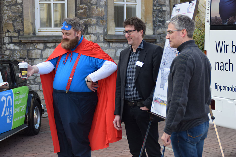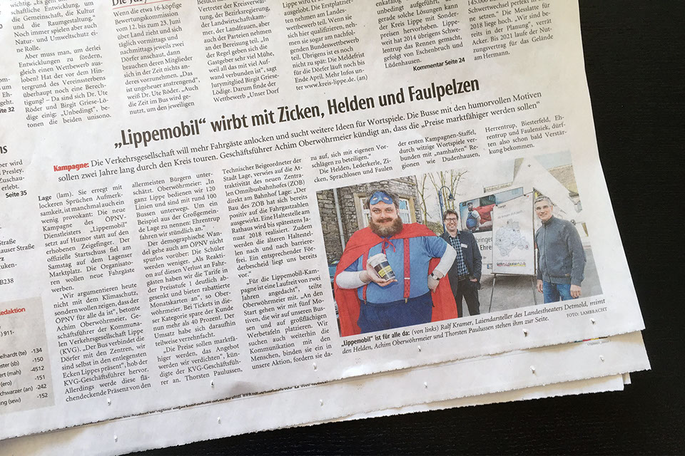 Der offizielle Start war der 25. März auf dem Marktplatz in Lage. Die Kampagne verbindet durch witzige Wortspiele interessante Typen mit besonderen Ortsnamen in Lippe. Zicken werden nach Biesterfeld und Helden werden nach Ehrentrup gebracht. Und Held der Mobilität konnte man auch auf dem Marktplatz von Lage werden. Gedankliche und körperliche Mobilität wurden bei sonnigem Frühlingswetter getestet und belohnt.