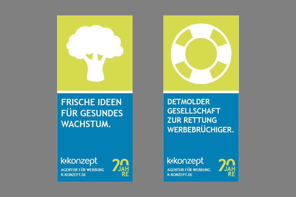 Oder doch? Nicht nur eine, sondern wieder eine ganze Serie mit den 20 Jahren. Weil Piktogramme für sich stehen - und in diesem Fall auch für uns - haben wir sie auch dieses Mal ergänzt und mittels Texteinsatz in einem Satz, eine verständliche Auflösung erzielt. Und so bieten wir auch dieses Mal wieder Antworten auf die Frage: „Warum k-konzept“? Mit einem Augenzwinkern und reflektierter Versiertheit versehen, kommt unser Werbe-Ein-Satz ab sofort auf crossmedialer Ebene zum Einsatz.