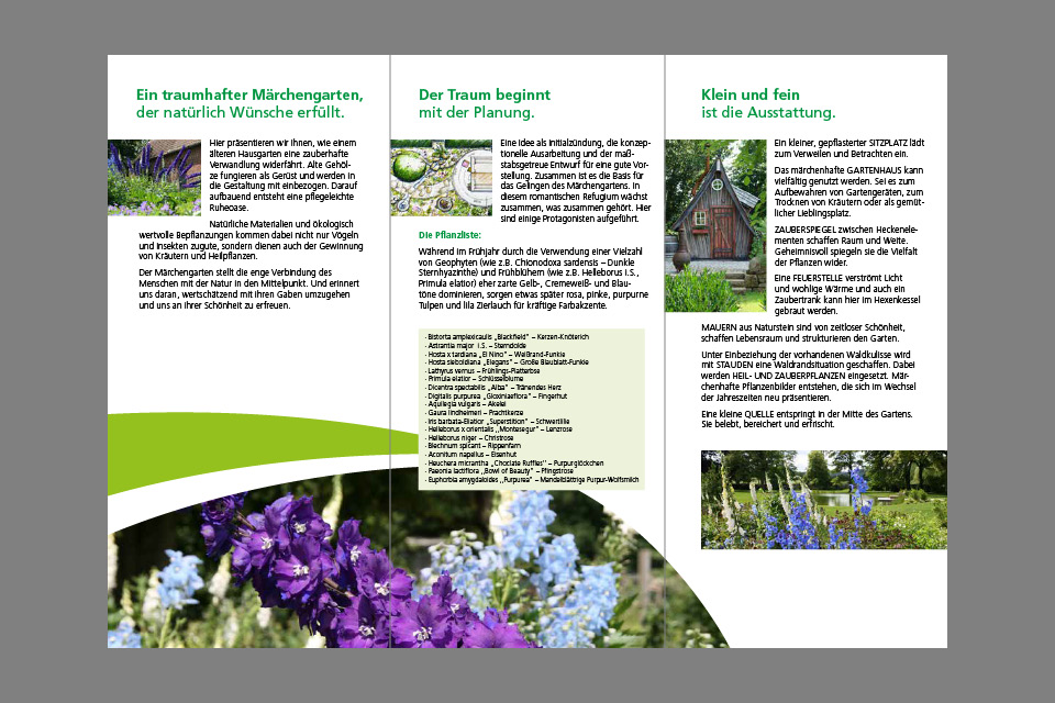 05.2017. Fast vor der Haustür findet in Bad Lippspringe die Landesgartenschau statt. Sechs Monate lassen sich Blumenpracht und Waldidylle bestaunen. Unser Kunde „Der Garten Detmold“ trägt zur Faszination mit einem wunderschönen Märchengarten bei. Die k-konzeptler haben dazu einen Flyer gestaltet und die Website ergänzt. So wird der Märchengarten schon mal vorgestellt und soll zum Besuch einladen. Und natürlich ist „Der Garten Detmold“ auch gerne bereit, weitere märchenhafte Gärten zu gestalten...