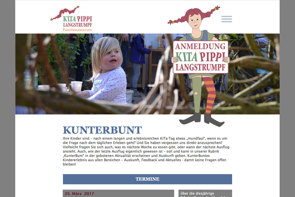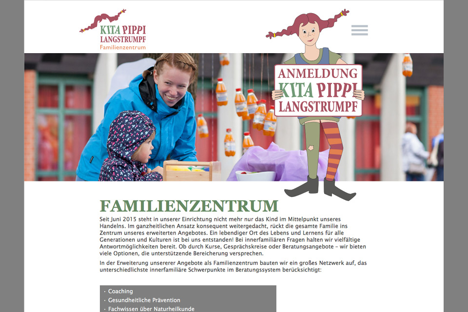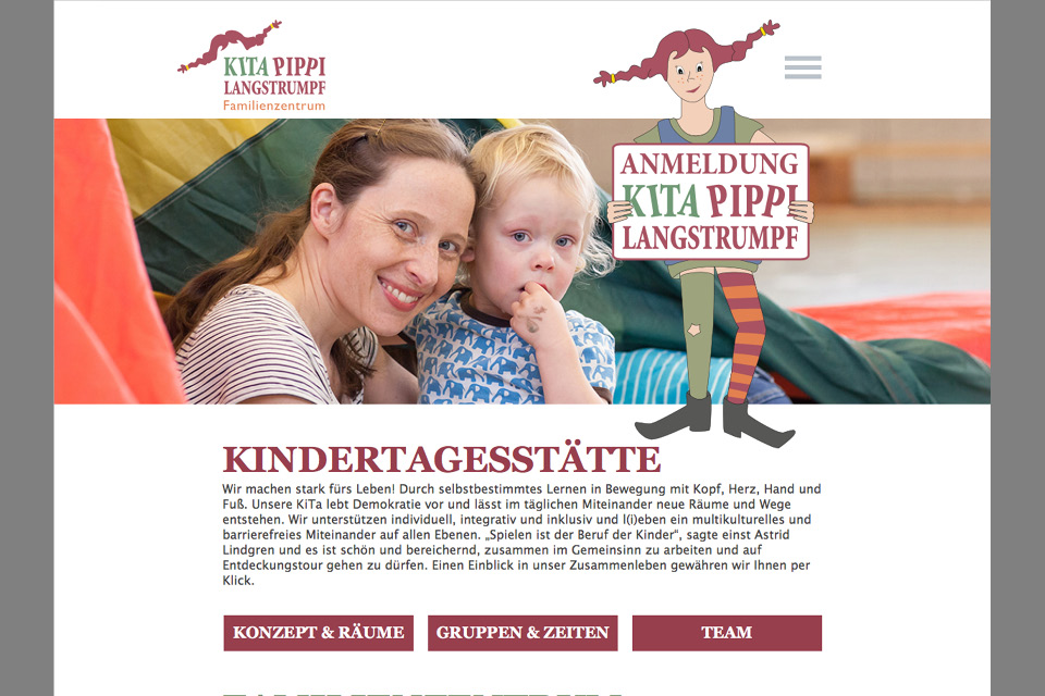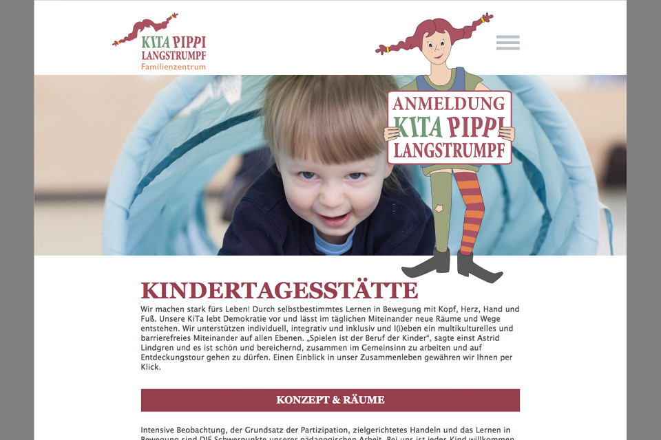 05.2017. Die neue Website des Familienzentrums Kita Pippi Langstrumpf ist fertig und online. Die k-konzeptler freuen sich über die konstruktive Zusammenarbeit und dass der digitale Auftritt dem ganzen Team zusagt. So zitieren sie auch Pippi Langstrumpf etwas freier: „Ich mach mir die Website, widde widde wie sie mir gefällt.“ In der Kita werden Kinder mit Freude, Spiel und Kreativität fürs Leben stark gemacht. „Spielen ist der Beruf der Kinder“ sagte schon Astrid Lindgren. Und dafür gibt es in dieser Kita genau die richtigen Berufsausbilder/innen!
