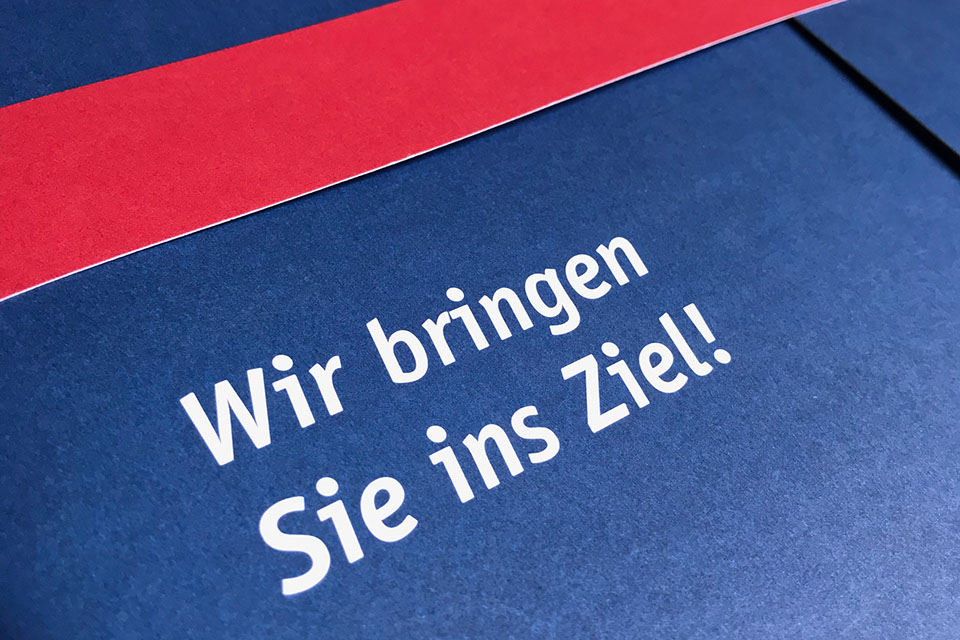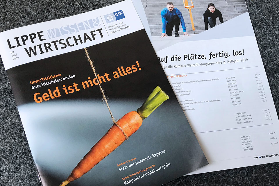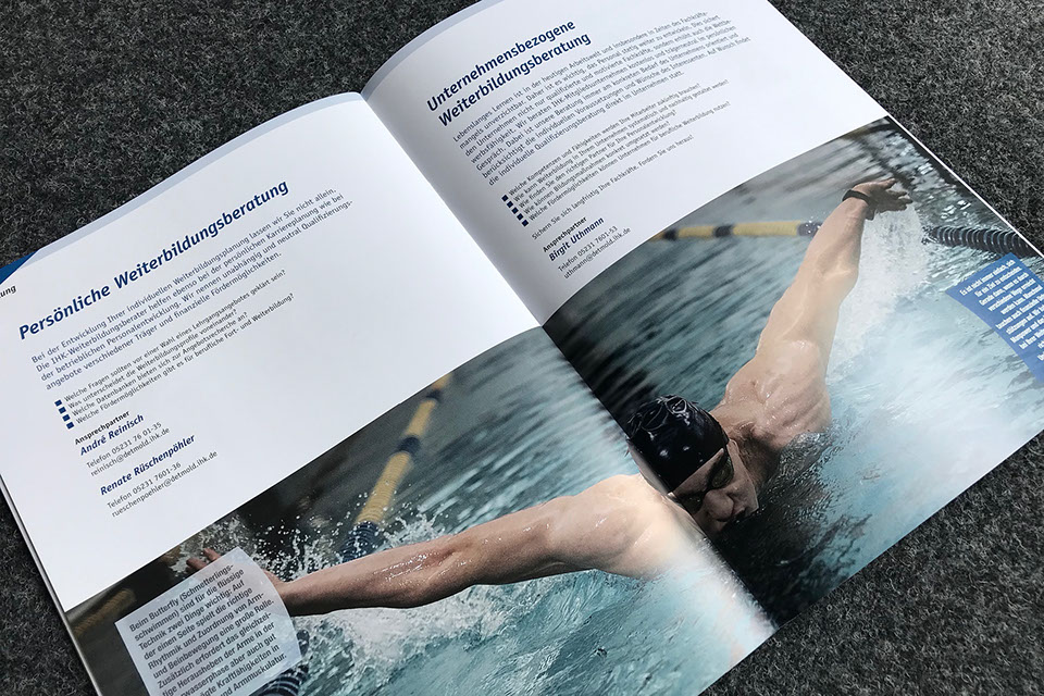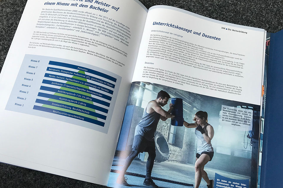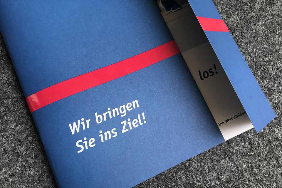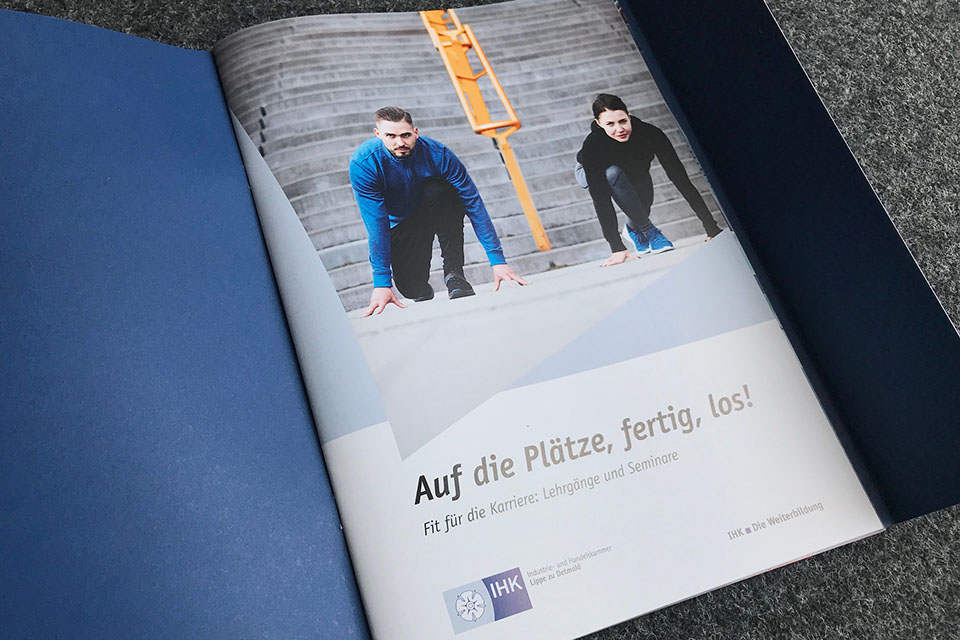 Diese Verbindung frischt das Thema Weiterbildung mit motivierenden Fitnessübungen auf. Sie findet sich in der Weiterbildungsbroschüre, in der Terminübersicht und in der IHK-Zeitschrift wieder. Von der Weiterbildungsbroschüre gibt es noch eine besondere Version für die persönliche Überreichung. Eine rote Banderole als Ziellinie um einen zusätzlichen blauen Umschlag symbolisiert die Möglichkeit, mit Hilfe der IHK Ziele in der Weiterbildung zu erreichen. Wir bringen Sie ins Ziel!