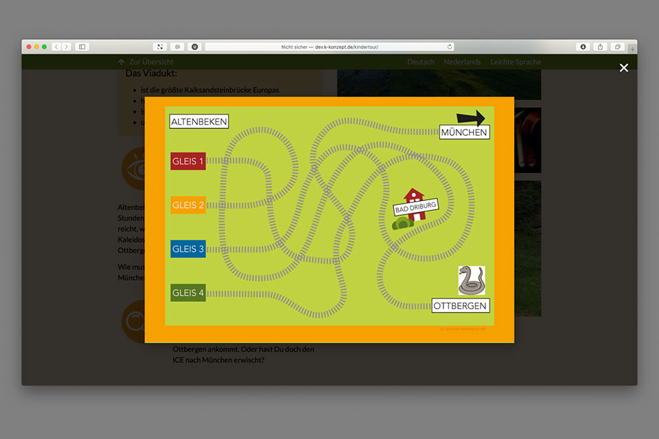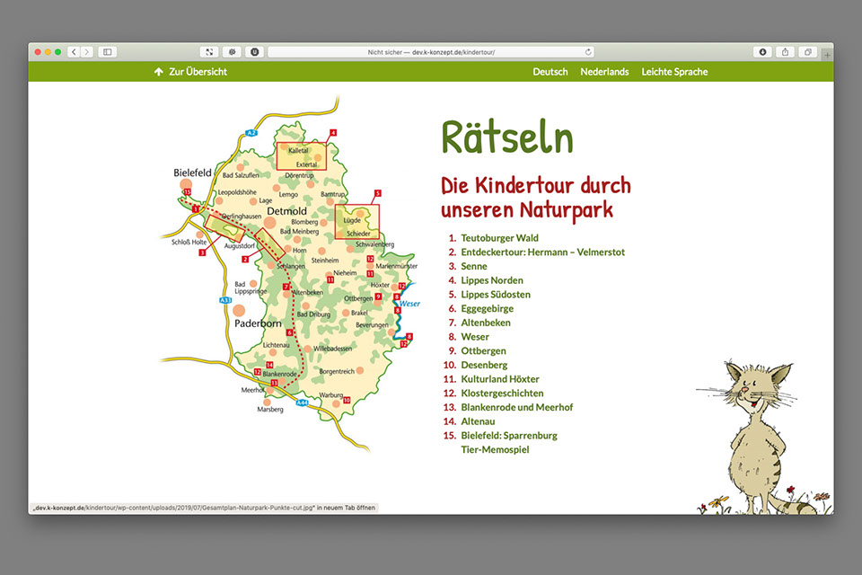 08.2019. Für den Kunden Naturpark Teutoburger Wald/Eggegebirge haben wir im Rahmen des EFRE-Projektes „KinderErlebniswelt Natur“ eine digitale Kindertour entwickelt. Die Herausforderung bestand in der Programmierung von individuellen Rätselspielen und im Kombinieren von Naturpark CD, gezeichneten Teutusfiguren, Hörgeschichten, Filmen, Icons und eben der digitalen Rätsel. Außerdem alles in drei Sprachen und passend für verschiedene Endgeräte.