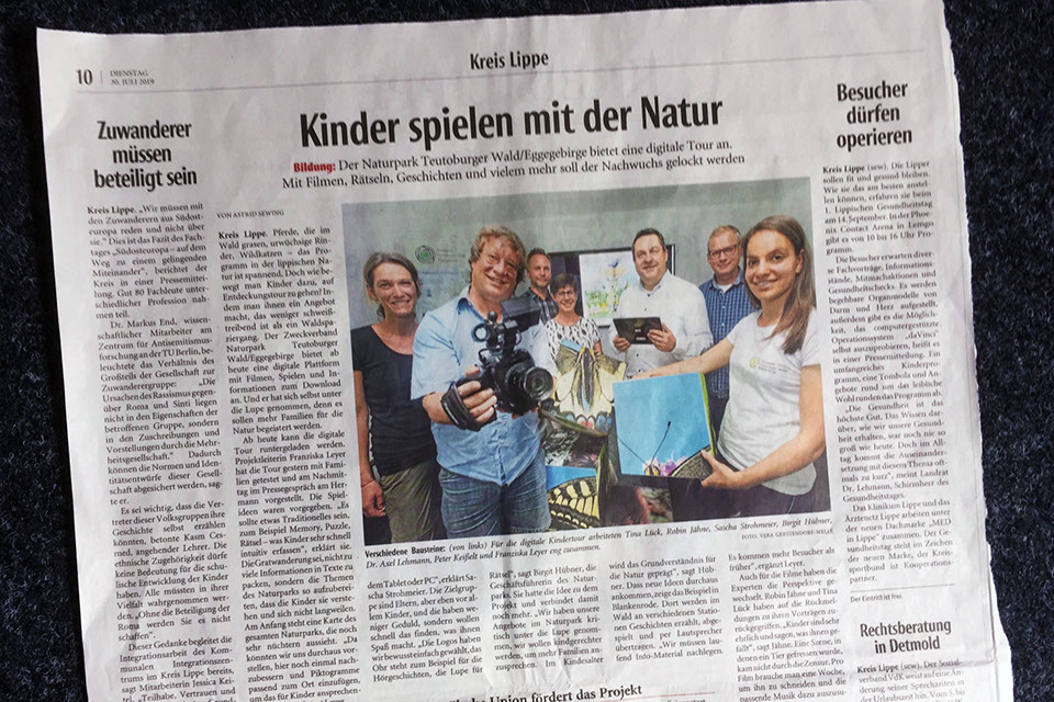Die digitale Kindertour wurde am 29. Juli bei sommerlichen Temperaturen im Kompetenzzentrum Wandern WALK auf der Pressekonferenz durch Landrat Dr. Axel Lehmann, der gleichzeitig auch Verbandsvorsteher des Naturparks ist, der Geschäftsführerin Birgit Hübner, der Projektleiterin Franziska Leyer und den Machern vorgestellt.