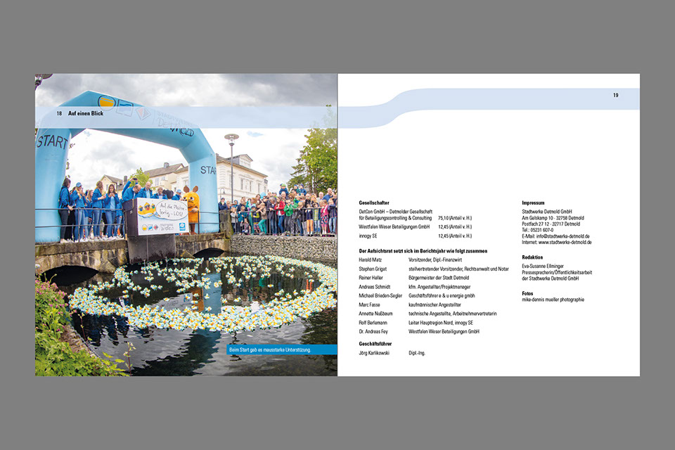 07.2019. Unser langjähriger Kunde Stadtwerke Detmold wollte die Reduktion der bisherigen Geschäftsberichte. Dem Abspecken der Inhalte folgte das kleinere Format und der geringere Umfang. Alles garniert mit der erfolgreichen Detmolder Veranstaltung Entenrennen am Wall mit Maus Show im Schlosspark. Nun ist der Geschäftsbericht 2018 quadratisch, praktisch, gut und rechtzeitig fertig.