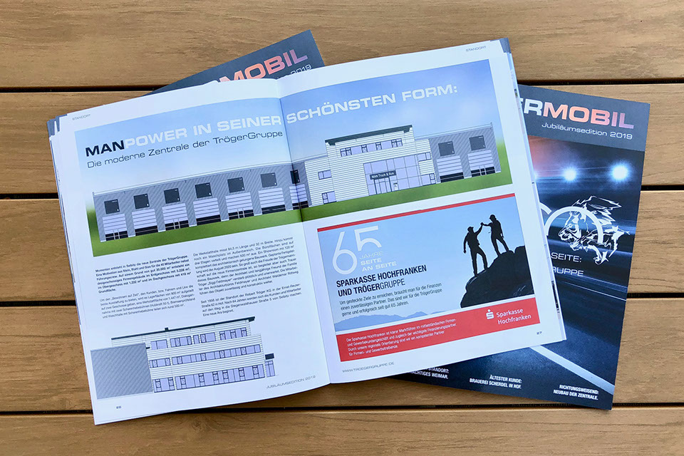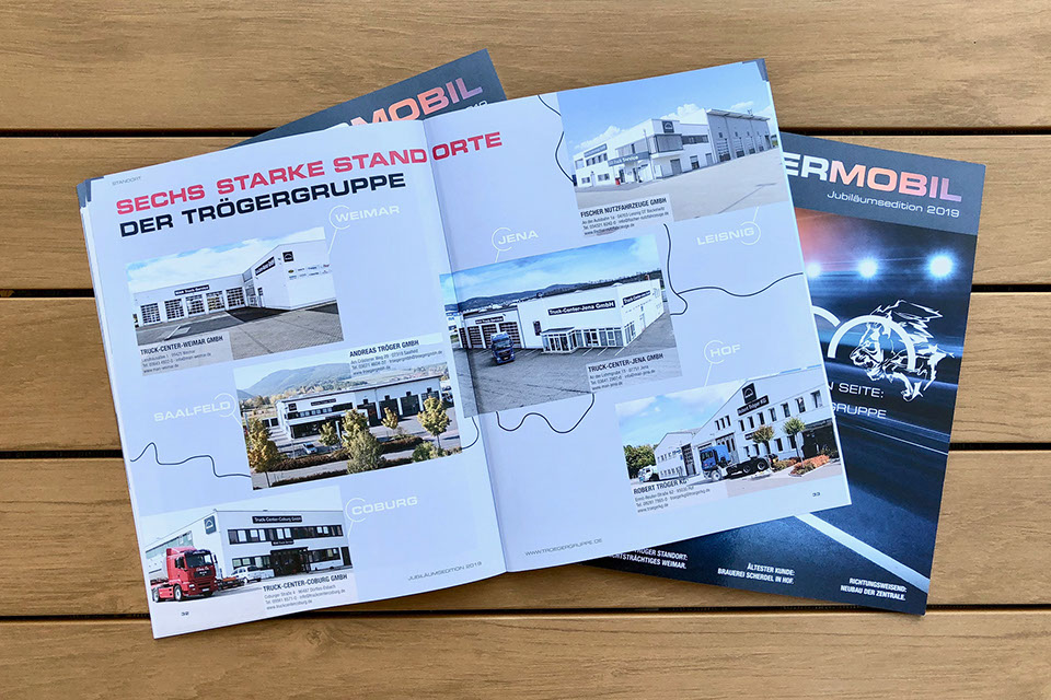10.2019. 100 Jahre ist unser Kunde, die TrögerGruppe, Seite an Seite mit MAN und somit ältester MAN-Partner der Welt. Von der Geschäftsleitung erhielten die k-konzeptler den Auftrag, eine Broschüre zu kreieren. Ein besonderes Material „Das Bauhaus Dessau Papier“ von Gmund passte hervorragend, denn auch das Bauhaus feiert in diesem Jahr die 100 Jahre. Eine Prägung und eine partielle Lackierung betonen das Ereignis dieser Partnerschaft.