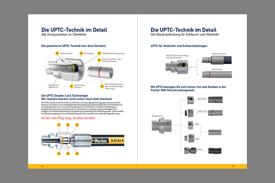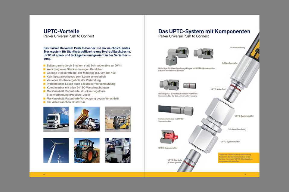 11.2019. Unser technischer Kunde Parker Hannifin ist in der Mobilhydraulik weltweit gut aufgestellt. Mit dem patentierten Stecksystem „Universal Push to Connect“ für Stahlhydraulikrohre und Hydraulikschläuche gewinnt man in der Serienfertigung eine leckagefreie Montage und eine Zeitersparnis von bis zu 50 %. Die k-konzeptler haben das für ihren langjährigen Kunden in einem 24-seitigen Prospekt und einem komprimierten Datenblatt gestaltet. Und dies in einer deutschen Fassung für den deutschsprachigen Raum und in englisch für den internationalen Einsatz ausgearbeitet.