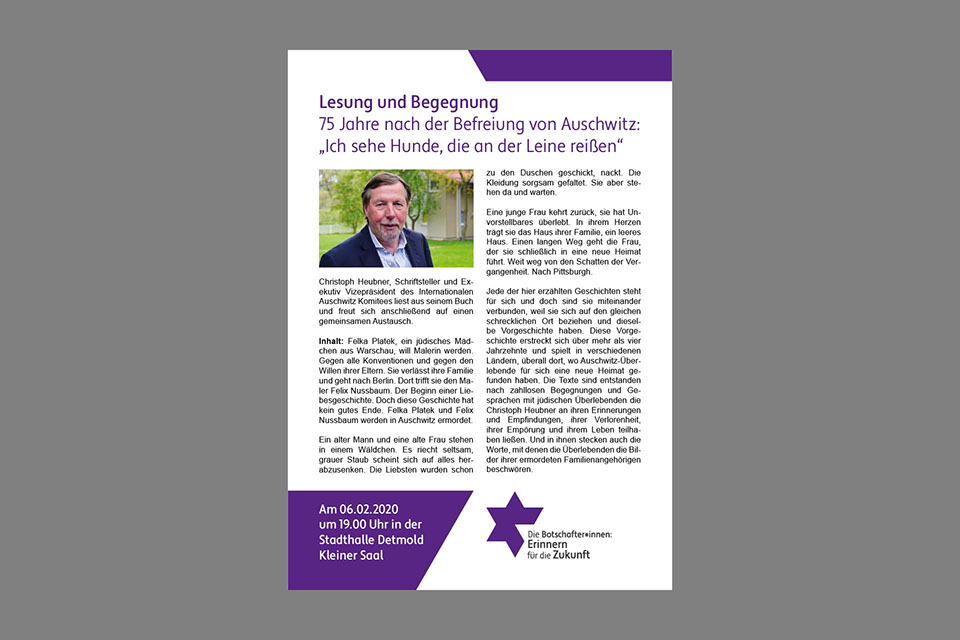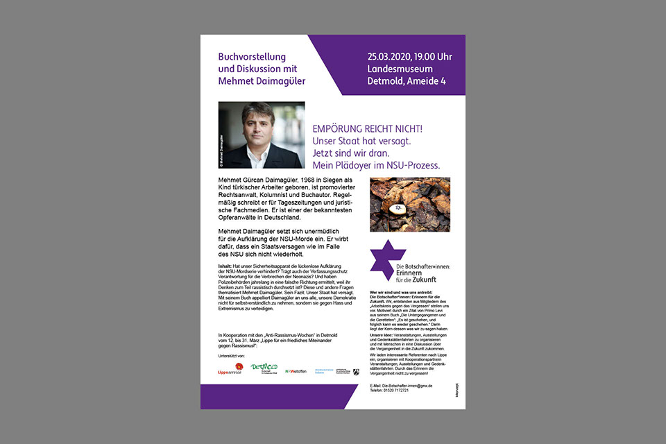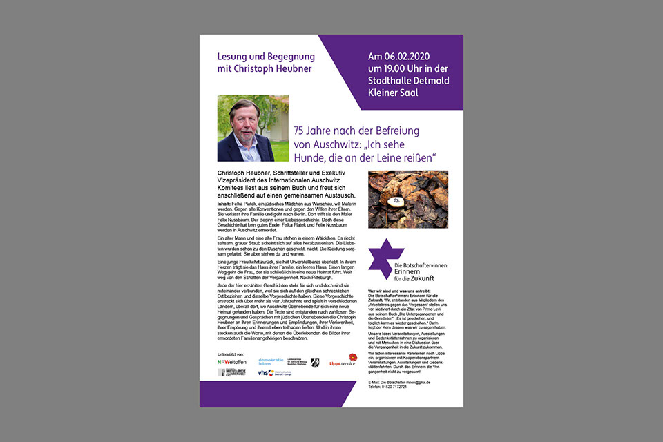 03.2020. Umtriebige Botschafter*innen: Sie entstanden aus Mitgliedern des „Arbeitskreis gegen das Vergessen“. Motiviert durch ein Zitat von Primo Levi aus seinem Buch „Die Untergegangenen und die Geretteten“: „Es ist geschehen, und folglich kann es wieder geschehen.“