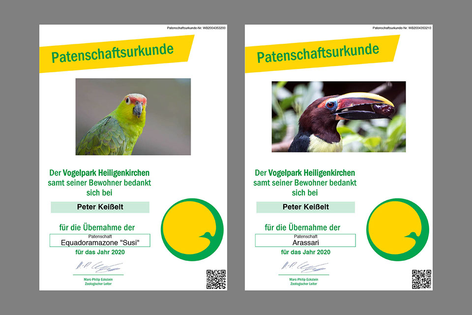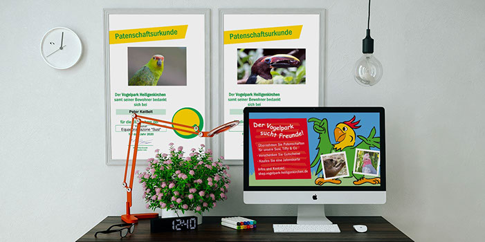 Die k-konzeptler betreuen den Vogelpark schon 16 Jahre und haben auch das Maskottchen „Matze“ entwickelt. Matze ist überall anzutreffen und auch bereits 15 Jahre alt. Nun freut er sich darüber, dass die k-konzeptler Paten der Equadoramazone „Susi“ und von „Arassari“ geworden sind.