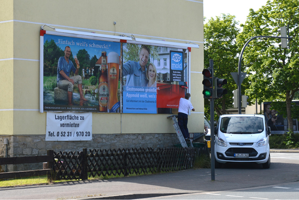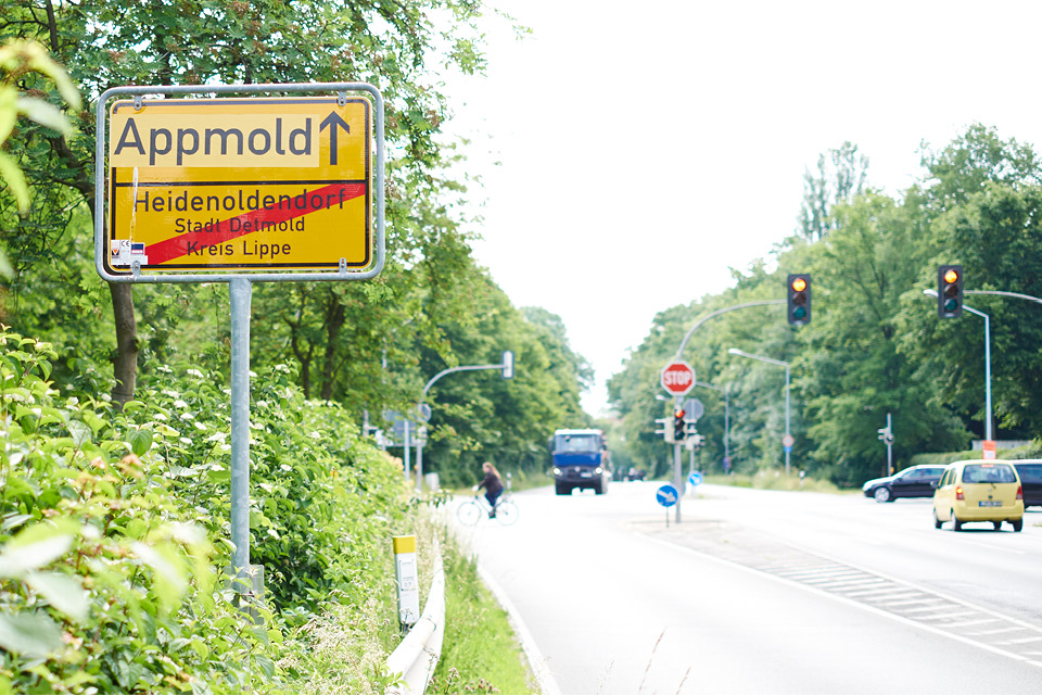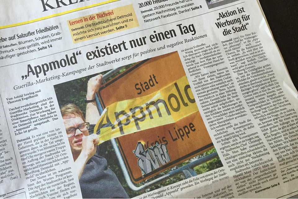06.2015. Ausgetüftelt bei einem Brainstorming mit der Marketingabteilung der Stadtwerke Detmold, Pantze Images und k-konzept. Appmold ist eine App für Detmold und alle Detmolder. Der Transfer von Appmold zum Stadtnamen Detmold gelingt direkt und optimal mit den entsprechenden Ortsschildern. Also reifte die Idee, alle Ortsschilder in einer Nachtaktion mit einer Folie zu überkleben. Selbstverständlich mit einer leicht lösbaren, die keinerlei Spuren hinterlässt. Auf einer Rundtour wurden alle Ortsschilder fotografiert, in eine Stadtkarte eingetragen und die Größe des Schriftzuges Detmold ausgemessen.