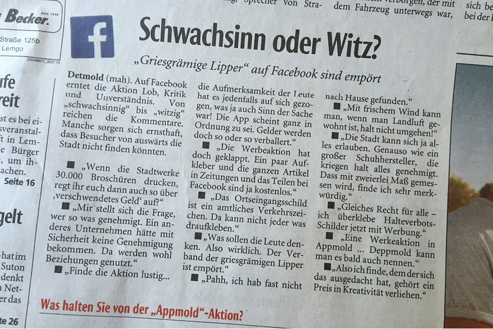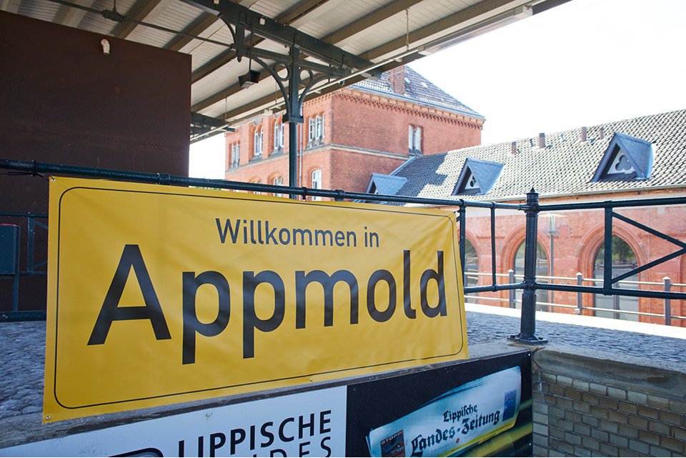 Das Resultat: 116 Schilder in 10 verschiedenen Größen Detmold. Da die dunkle Nachtphase relativ kurz ist, wurde das Gebiet in zwei Bereiche aufgeteilt und in der Nacht vom 10. auf den 11.06. mit zwei Teams durchforstet. Mit Warnweste, Kopfleuchte und kleiner Trittleiter ausgestattet wurden die Schilder überklebt und um 5.00 Uhr morgens war das Werk vollbracht. Zusätzlich wurden in der Innenstadt und am Bahnhof noch einige große Banner mit der Aussage „Willkommen in Appmold“ an Geländer angebracht, aber auch diese so, dass sie rückstandslos entfernt werden konnten. Allen Akteuren war klar, dass diese Maßnahme noch am gleichen Tag wieder entfernt werden muss. So wurden alle Spuren wie ein Spuk bereits um 17.00 Uhr wieder beseitigt.