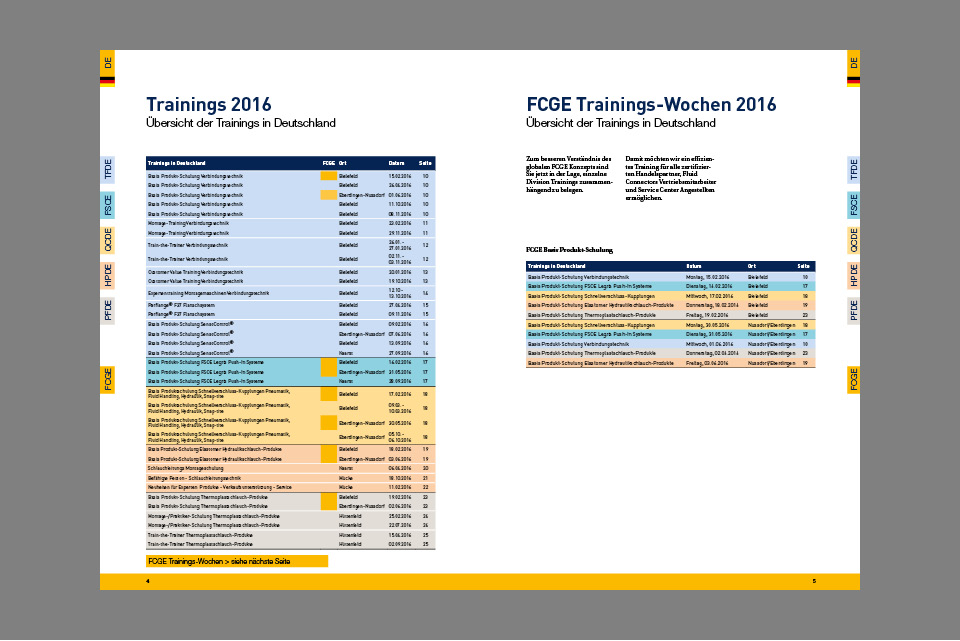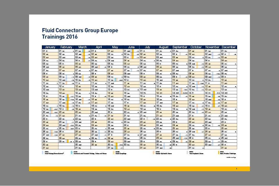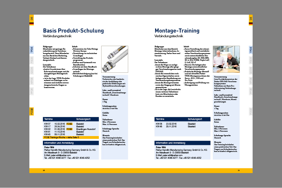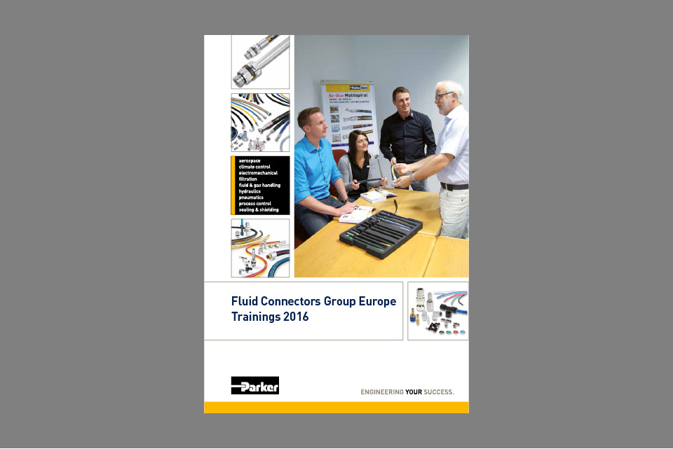 10.2015. Der Trainingsbroschüre haben die k-konzeptler den letzten Feinschliff gegeben und nun lässt der Drucker laufen. Danach können sich Kunden und Mitarbeiter aus Europa über die Produkte und Anwendungen der 6 Divisionen der Fluid Connectors Group Europe schulen lassen. Die Seminare finden in verschiedenen Sprachen statt.