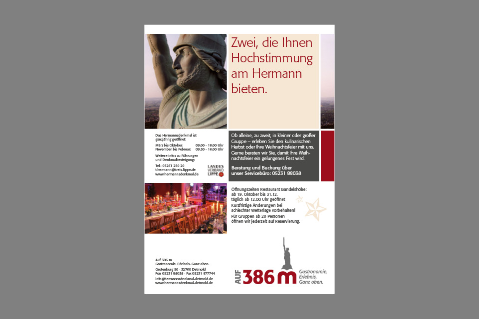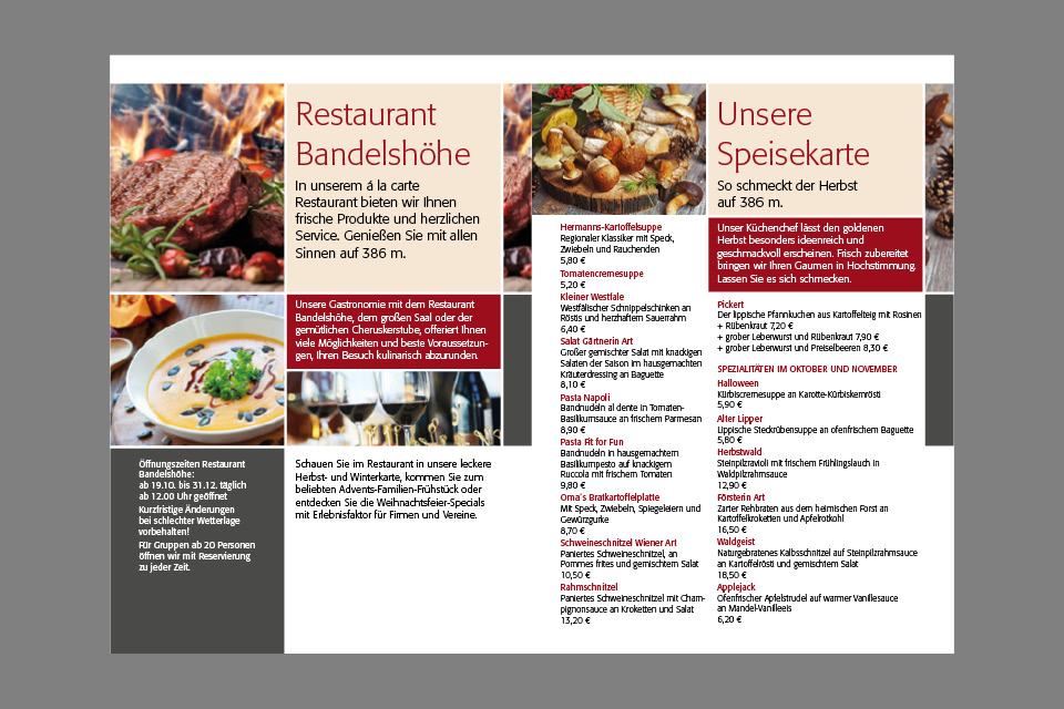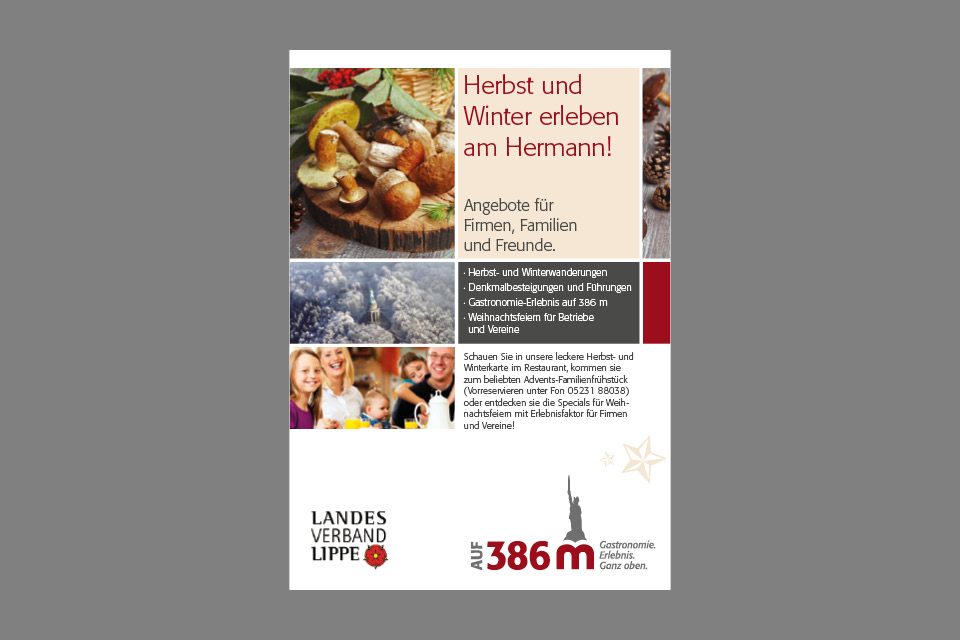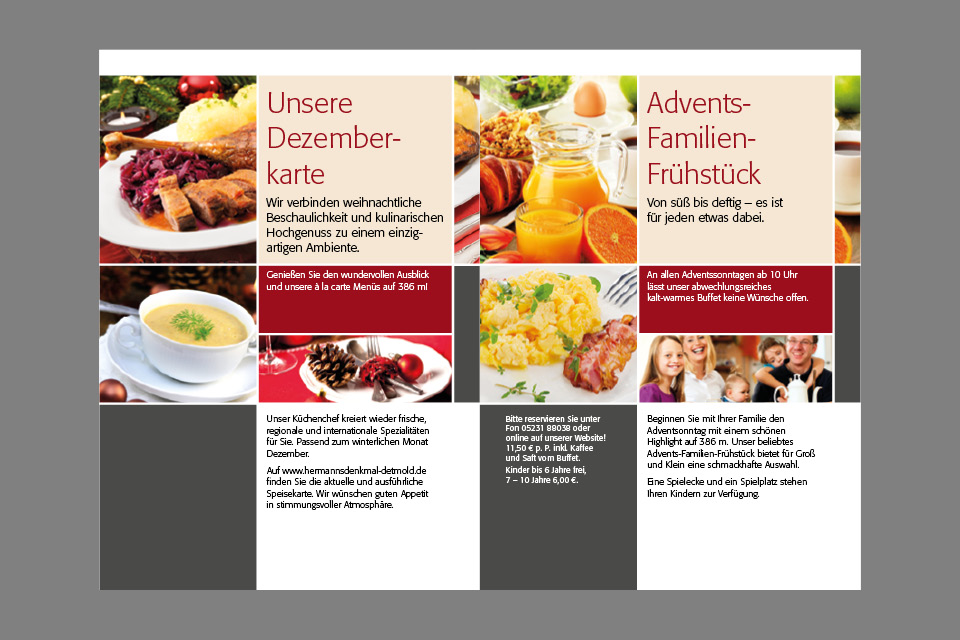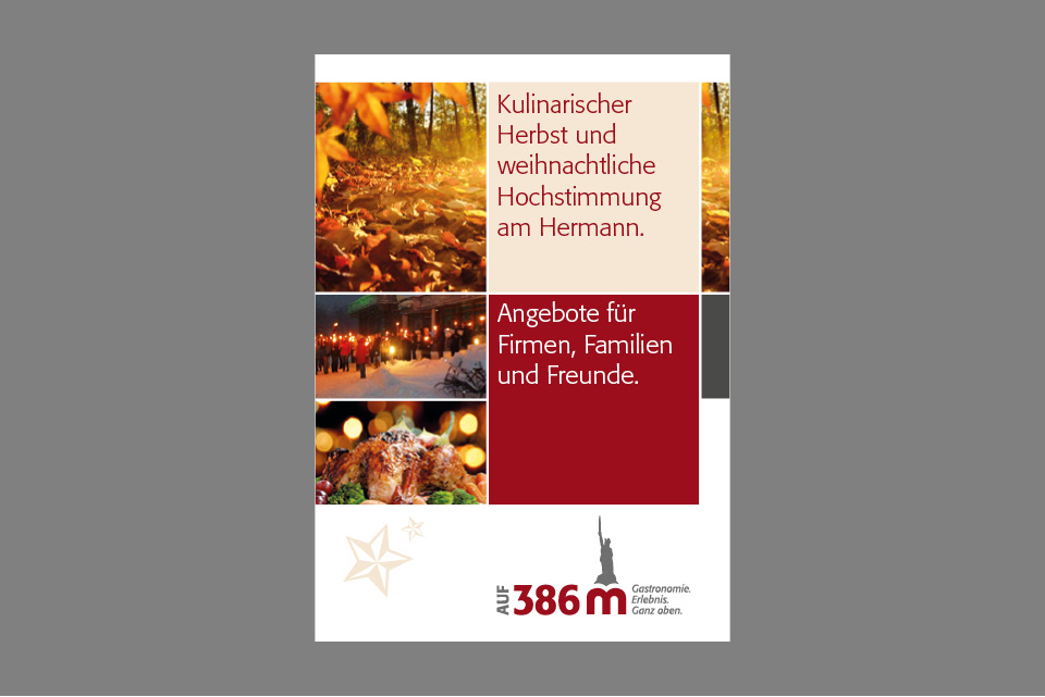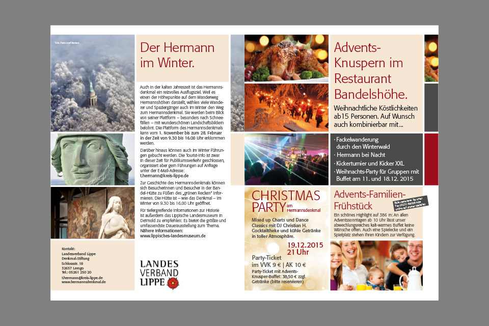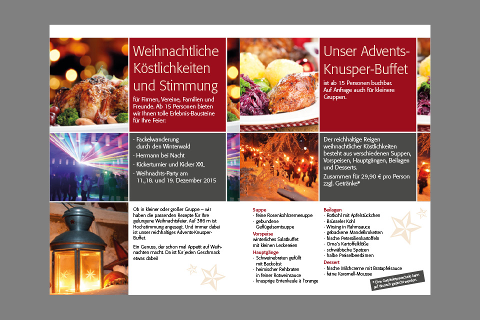 Adventsknuspern, Fackelwanderungen, Hermann bei Nacht, Kickerturnier oder Weihnachtsparty. Das kompetente Team um Guido Röcken bietet seinen Gästen Hochgenuss mit allen Sinnen. Letztes Jahr haben die k-konzeptler das Angebot ausführlich getestet und können es weiterempfehlen. Und damit das jeder weiß, haben wir eine kleine Broschüre und einen Prospekt gestaltet, der an 40.000 Haushalte ging. Appetit auf mehr: