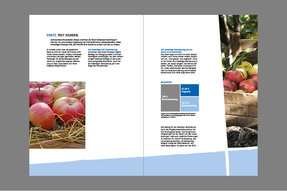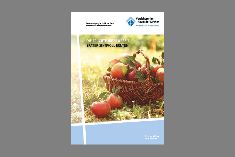 So entstand der Prospekt, der von der Zusatzversorgung für Mitarbeiter im kirchlichen Dienst berichtet und mittels „apfeltitlicher“ Motive garniert wurde.
