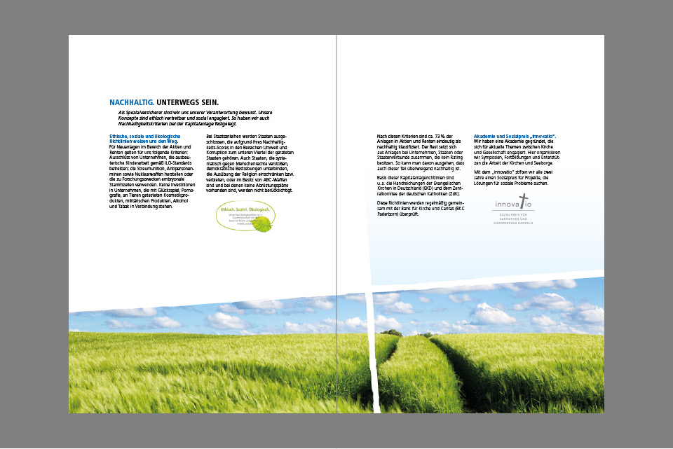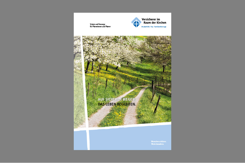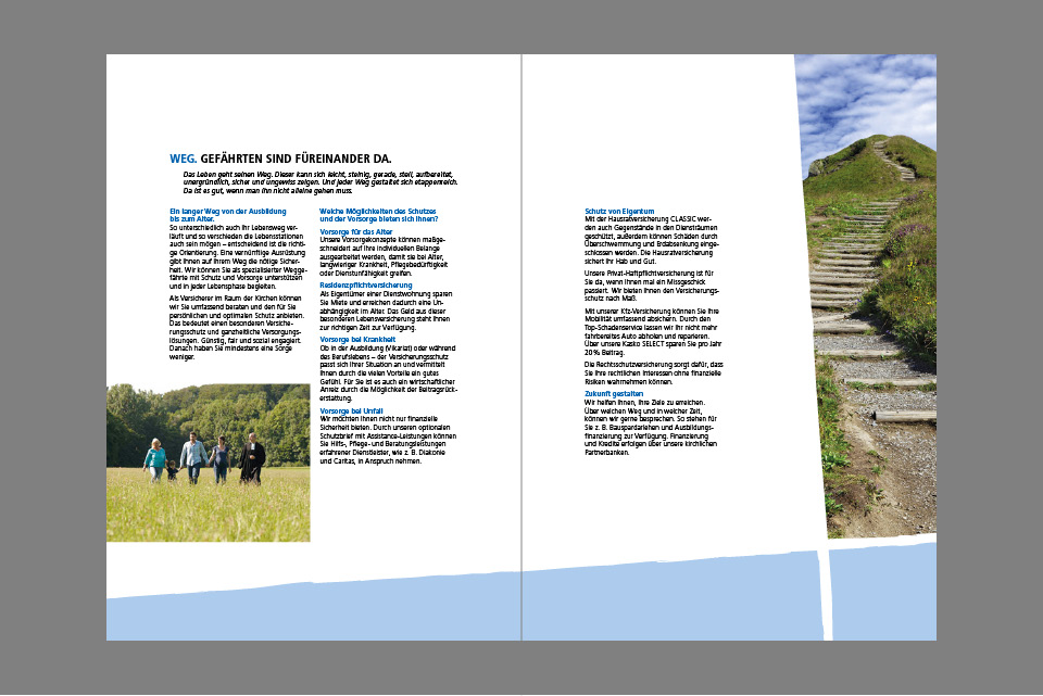 Außerdem noch ein Prospekt, der sich mit dem Schutz und der Vorsorge für Pfarrerinnen und Pfarrer von der Ausbildung bis zum Alter befasst. Hier werden nicht nur inhaltlich Wege aufgezeigt, sondern sie führen auch durch eine Augenweide. Weg. Gefährten sind füreinander da.