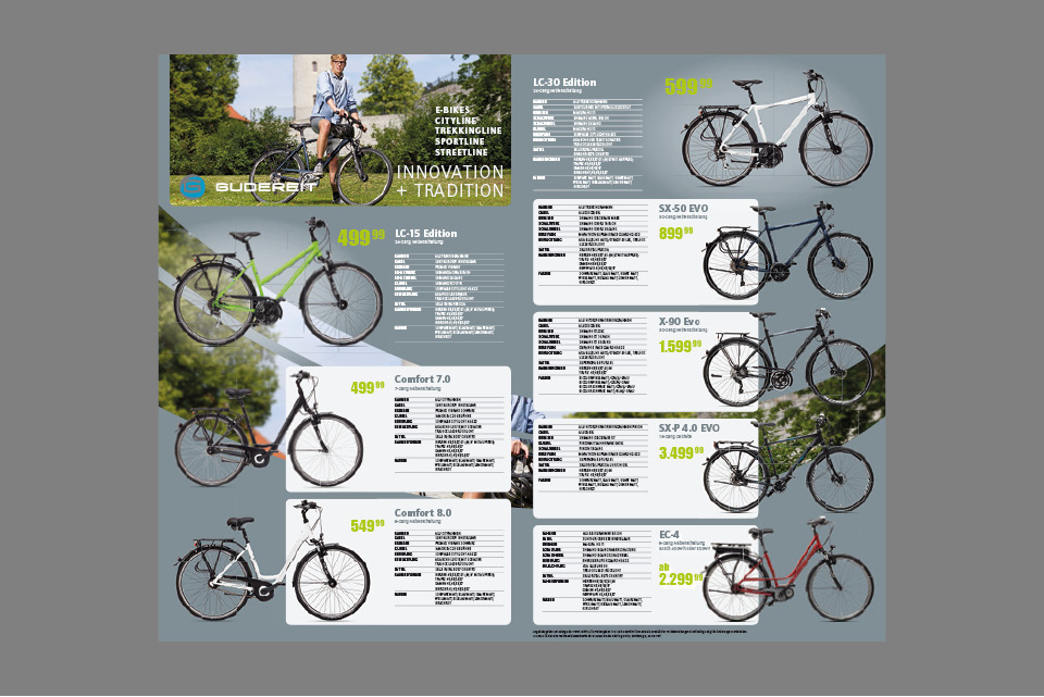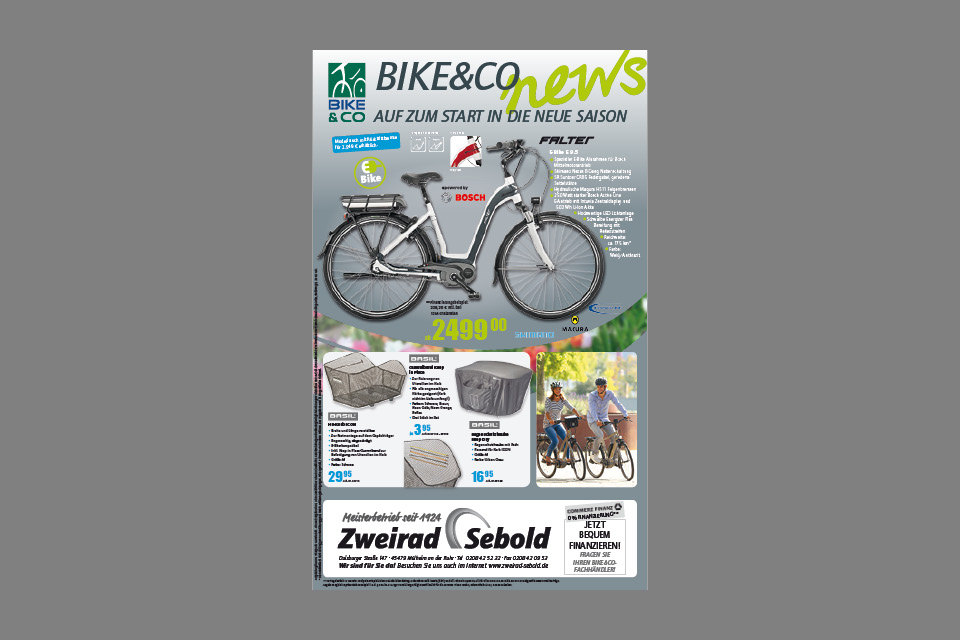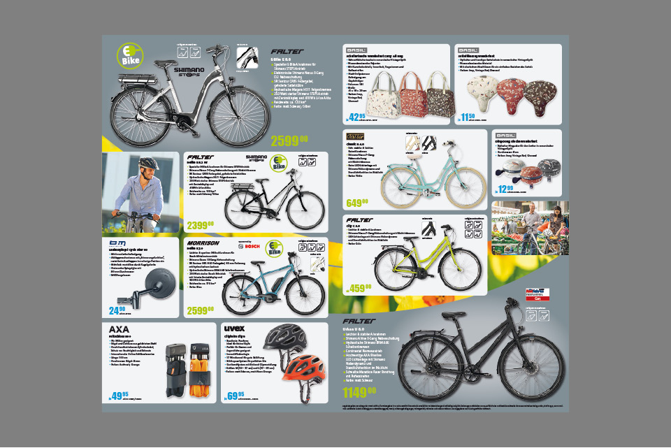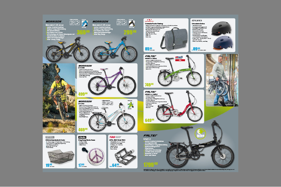 Das Resultat sind Frühjahrsprospekte für die Fachhändler in ganz Deutschland. Diese können aus verschiedenen Prospektversionen nach Händlerstatus, Marken, Finanzierung und Preisversion wählen. Die Prospekte haben das dynamische Format von 26 x 42 cm und drehen sich um neue Produkte rund ums Rad. Damit gelingt der Start in die neue Saison!