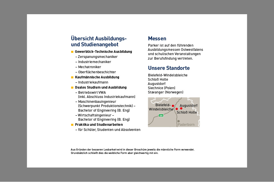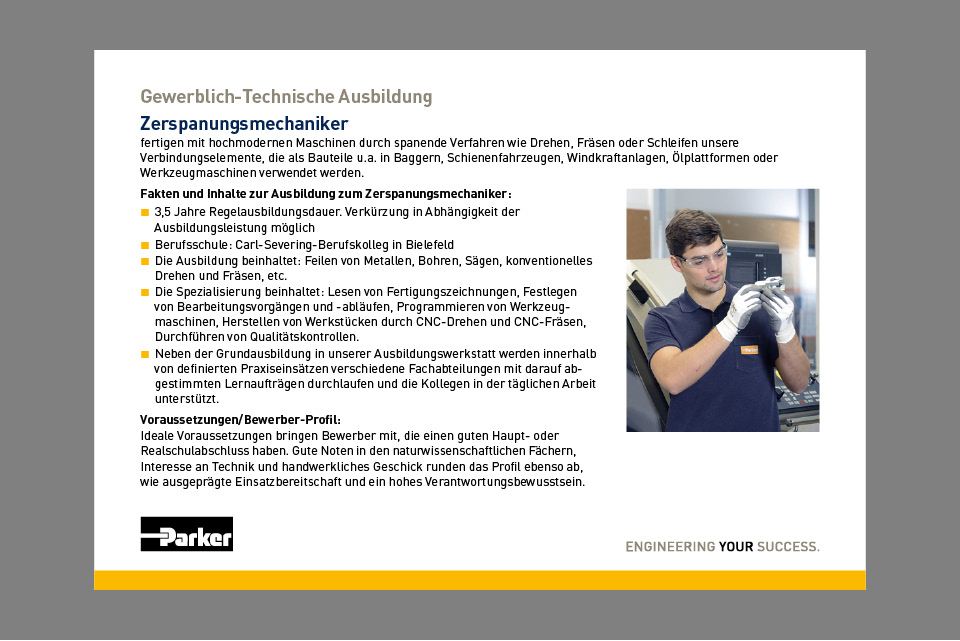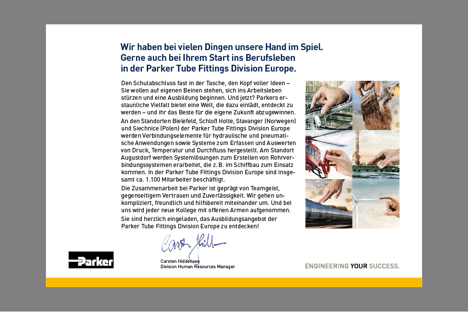 03.2016. Unser Kunde Parker Tube Fittings Division Europe ist seit Jahren im Ausbildungssektor sehr aktiv. Sich eigene Fach- und Führungskräfte heranzuziehen, das macht auch Sinn. In acht Bereichen werden junge Menschen ausgebildet, damit sie vielleicht irgendwann zu den rund 1.100 Mitarbeitern der Parker TFDE gehören.