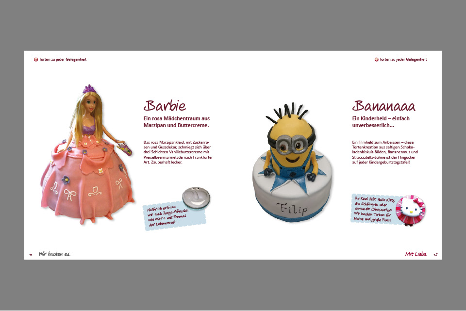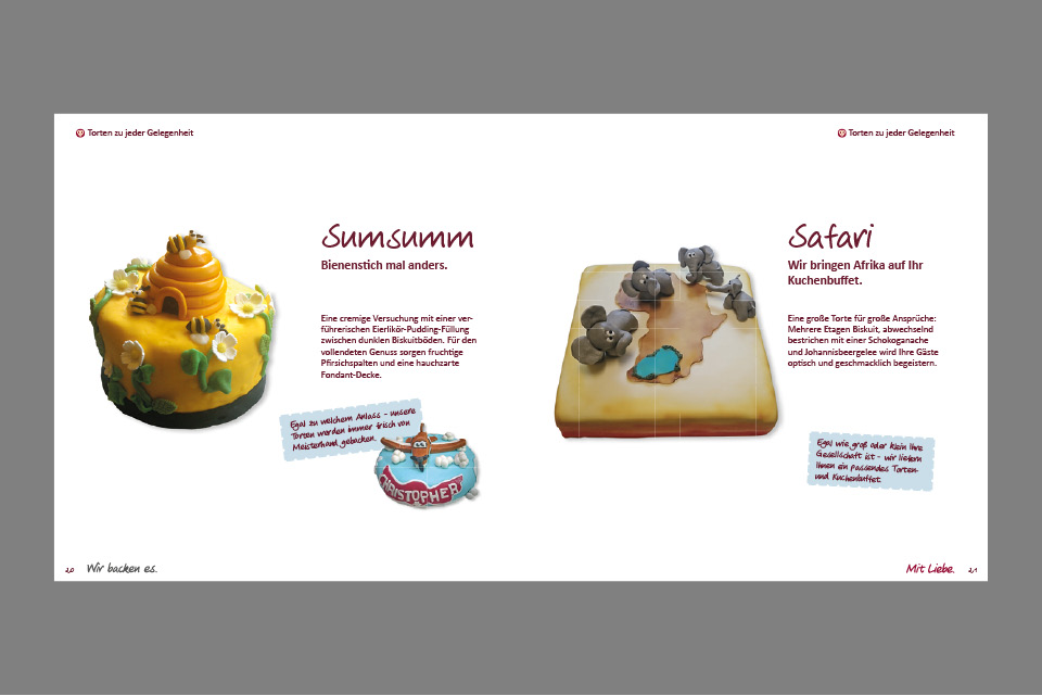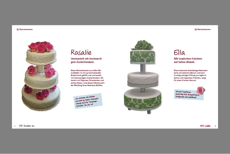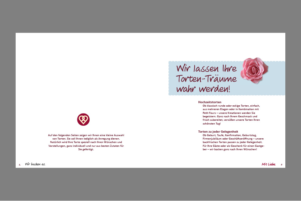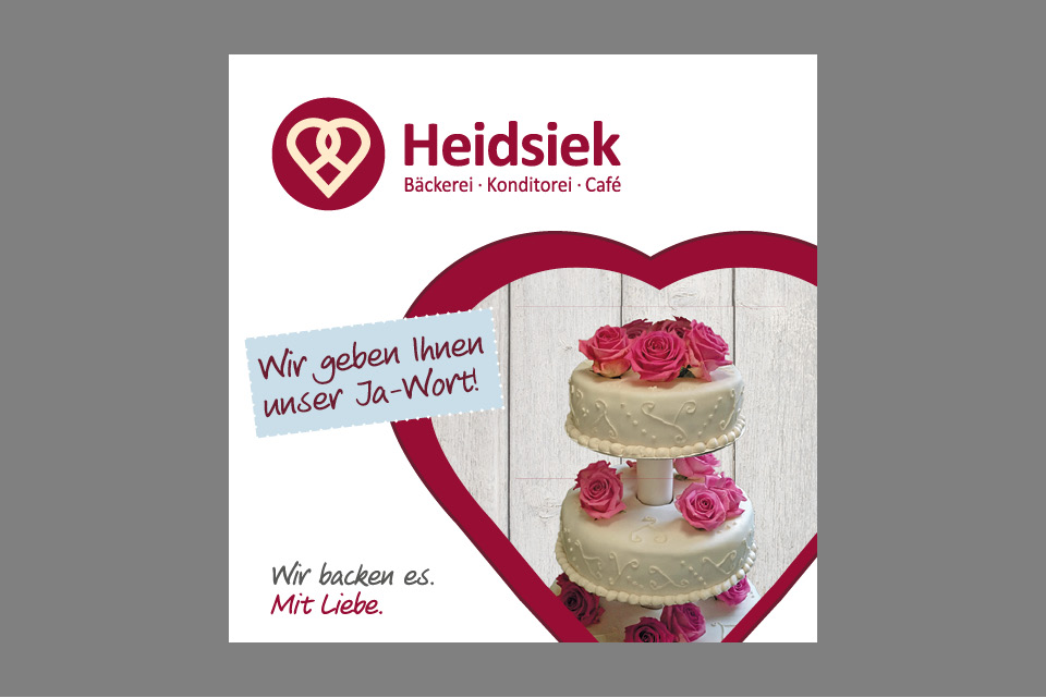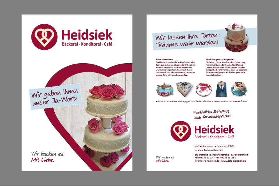 Und hier lag auch die größte handwerkliche Herausforderung für die k-konzeptler, die Amateuraufnahmen freizustellen und zu retuschieren. Dazu nehme man noch etwas Kreativität und Textergüsse und fertig ist eine geschmackvolle Broschüre. Mit ihr wird das Heidsiek Team nun seinen Kunden vermitteln, was es so alles individuell handfertigen kann. Sie backen es. Mit Liebe.