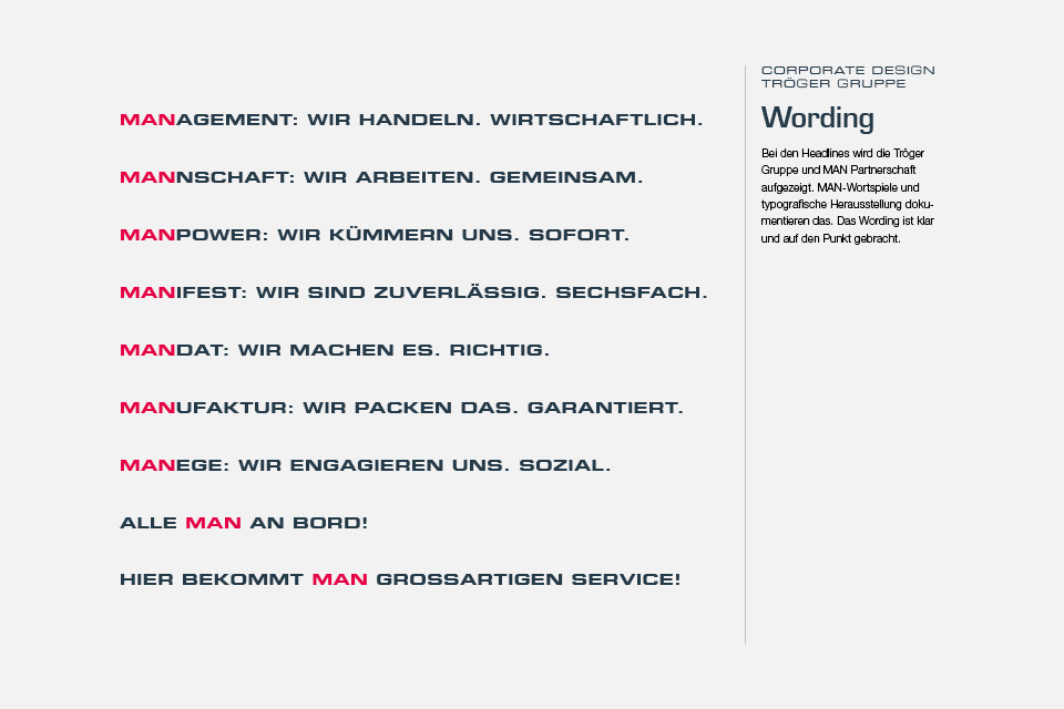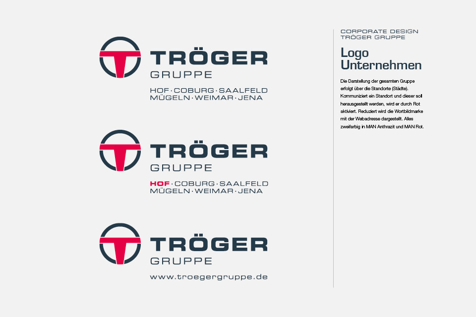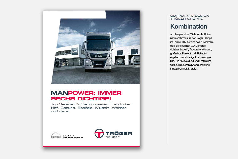 Die k-konzeptler hatten die Aufgabe, eine visuelle Vereinheitlichung der sechs Unternehmen zu entwickeln. Das gelang durch die Dachmarke und die Darstellung der Standorte. Mit der Verabschiedung des Logos im Coburger Kreis erteilte der neue Kunde auch den Auftrag für das Corporate Design. Die Besonderheit war hier die Abstimmung und Synergie mit dem MAN-CD.