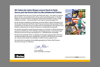 04.2019. Für den langjährigen Kunden Parker Hannifin haben die k-konzeptler erneut eine Ausbildungsbroschüre erstellt. Im handlichen Format informiert sie kompakt über das attraktive Ausbildungs- und Studienangebot der Parker High Pressure Connectors Europe mit seinen sechs Standorten in Europa. Parker bietet viele Vorteile in der Ausbildung und ist als „Best Place to learn“ Top-Ausbilder 2019 bis 2021 ausgezeichnet worden.