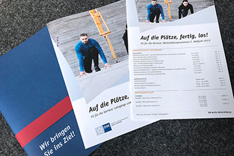 Diese Verbindung frischt das Thema Weiterbildung mit motivierenden Fitnessübungen auf. Sie findet sich in der Weiterbildungsbroschüre, in der Terminübersicht und in der IHK-Zeitschrift wieder. Von der Weiterbildungsbroschüre gibt es noch eine besondere Version für die persönliche Überreichung. Eine rote Banderole als Ziellinie um einen zusätzlichen blauen Umschlag symbolisiert die Möglichkeit, mit Hilfe der IHK Ziele in der Weiterbildung zu erreichen. Wir bringen Sie ins Ziel!