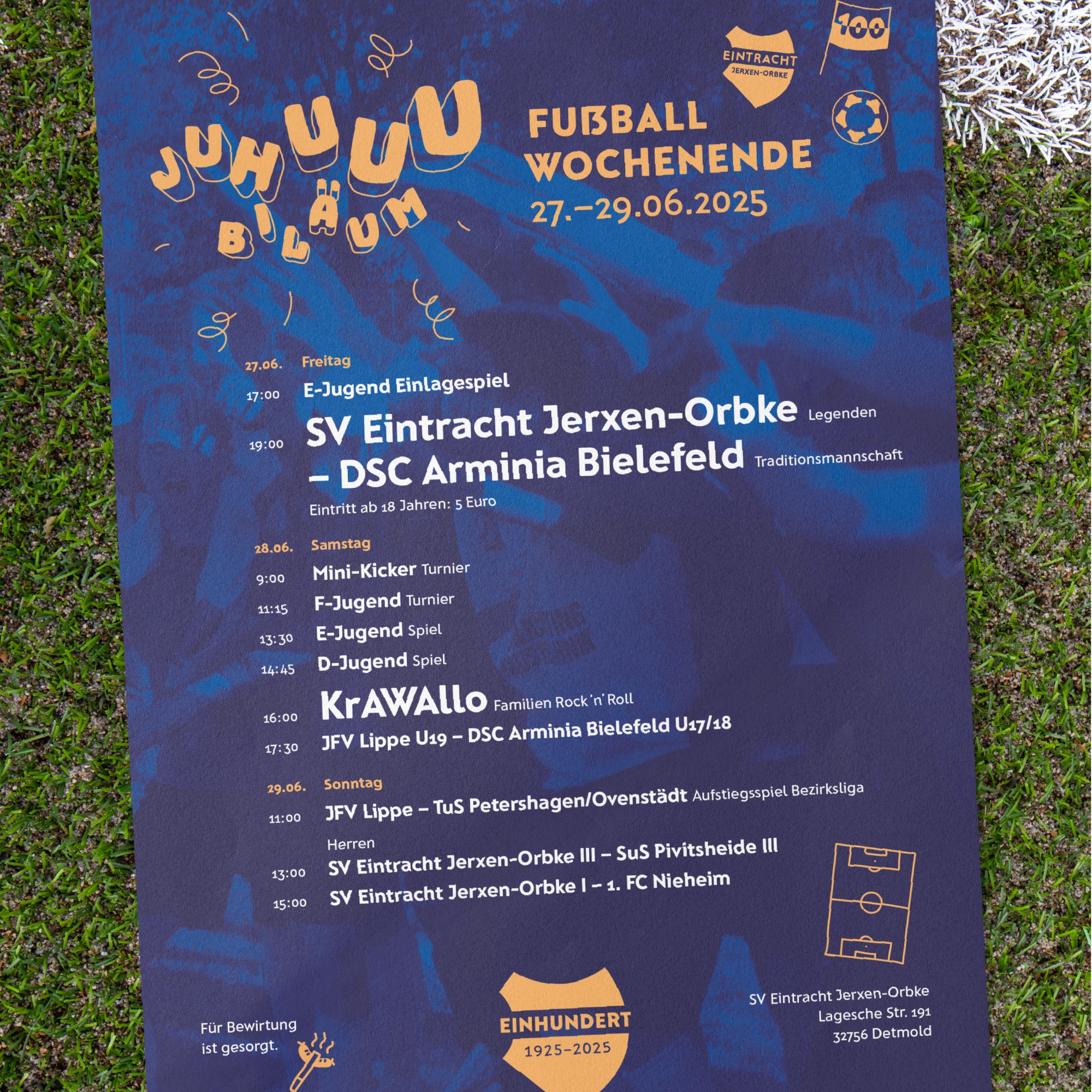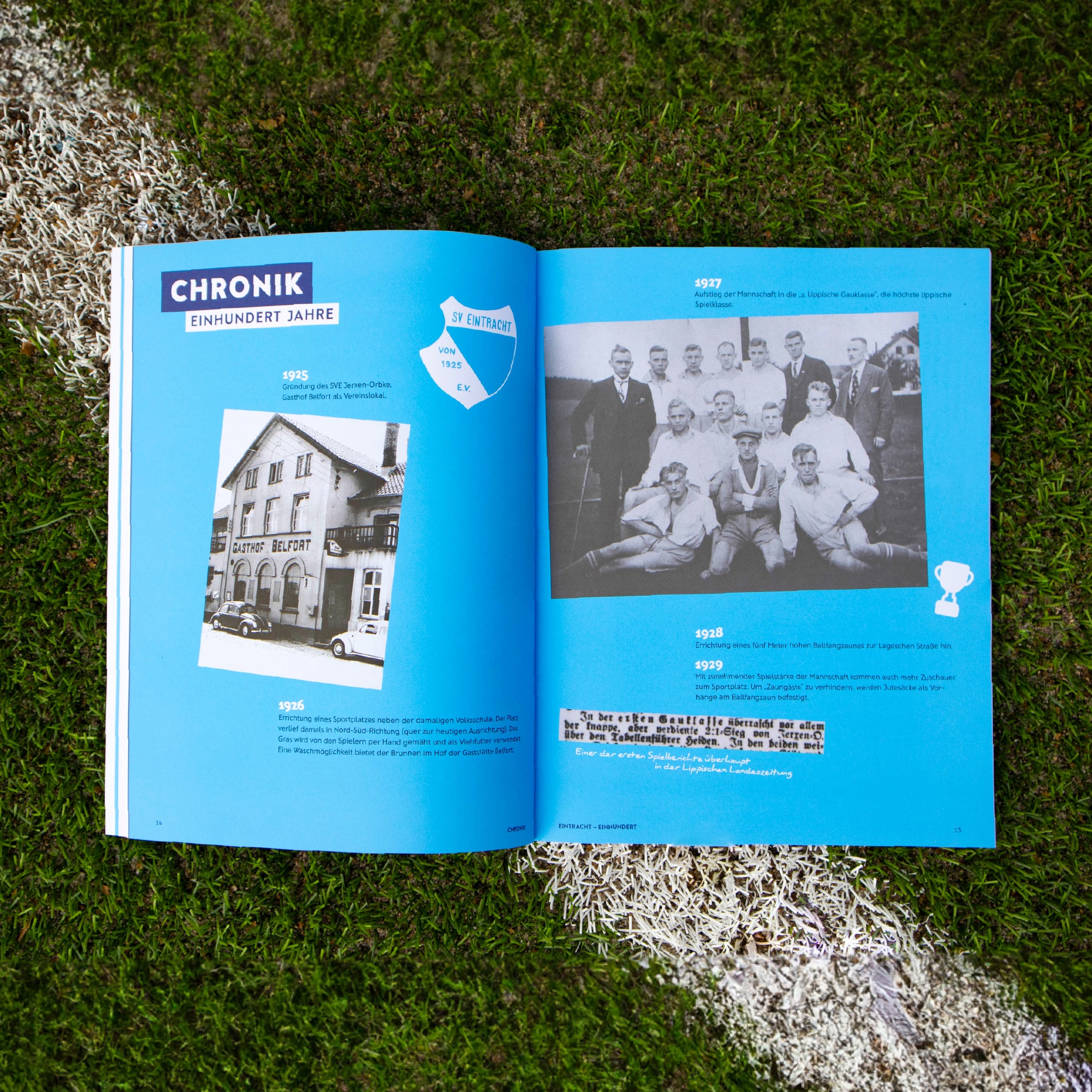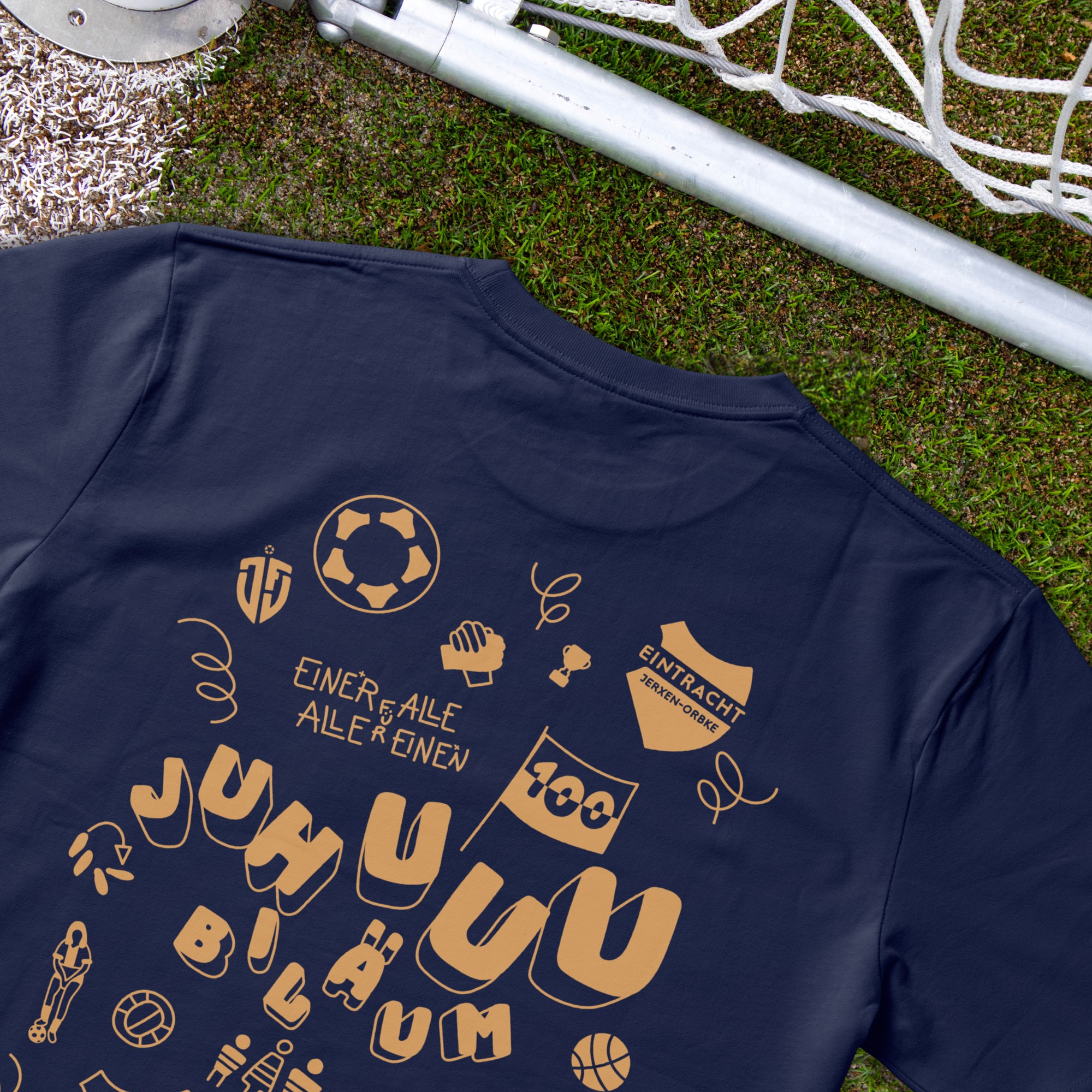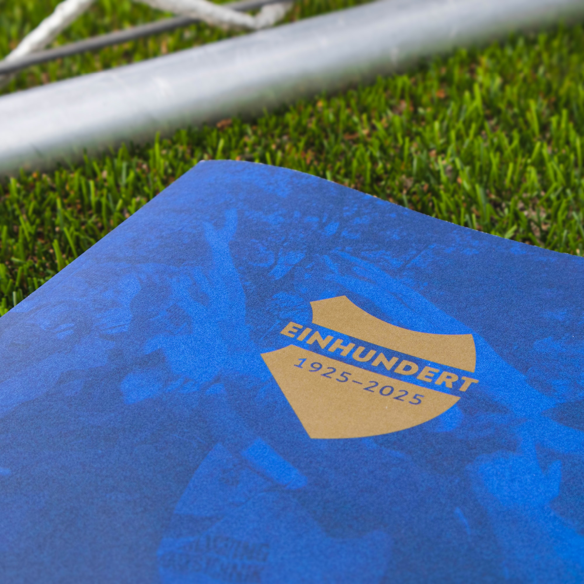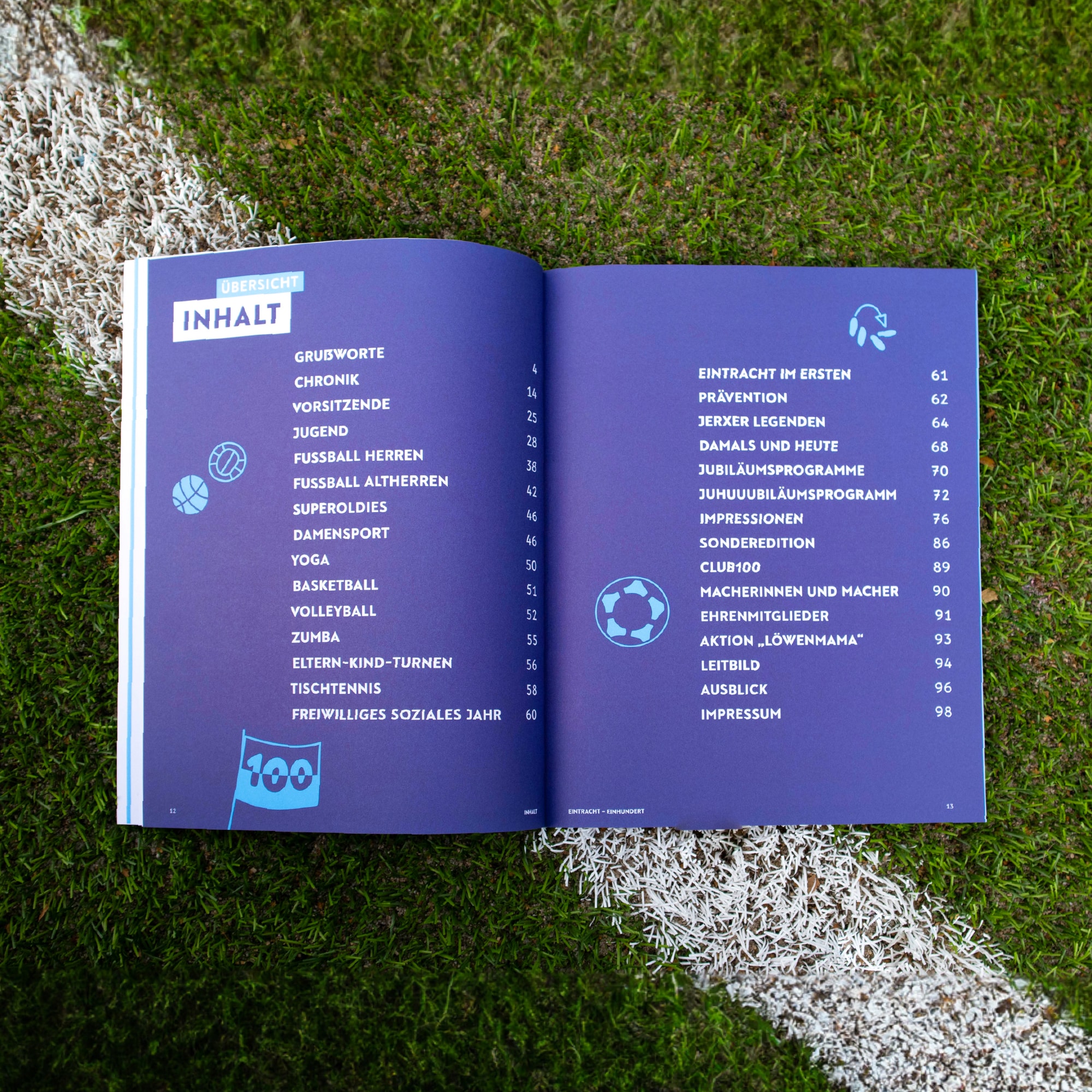 Auch mit einhundert Jahren ist die Eintracht durch ihre Mitglieder ein lebendiger Verein, der diese beeindruckende Leistung mit Stolz auf der Brust trägt. Für das ›Juhuuubiläum‹ haben wir aus dem ›Eintracht‹ im Vereinswappen konsequenterweise eine ›Einhundert‹ gemacht. Neben der Broschüre haben wir Roll-Ups für die dazugehörige Ausstellung, Merch und Plakate gestaltet.