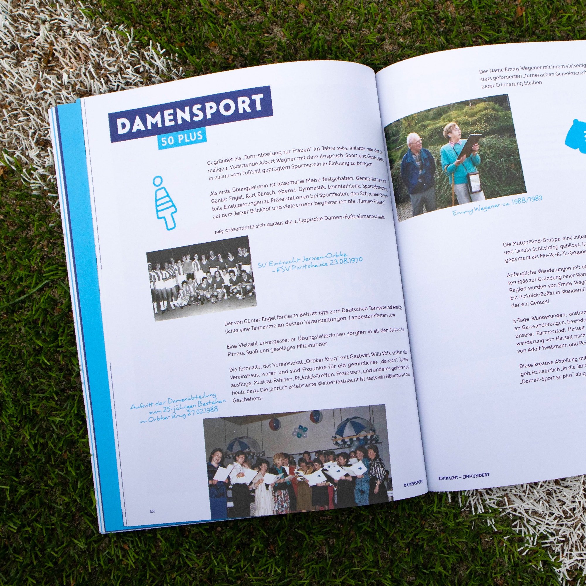 Mit einem Keyvisual wie ein Knallbonbon aus einhundert Jahren Vereinsleben. Illustrationen, Handgeschriebenes und wie eingeklebt wirkende historische Fotos transportieren den Teamgeist und die Begeisterung verschiedener Generationen im Verein. Es wird angepackt. 1926 wurde der Sportplatz noch von Spielern per Hand gemäht und der Rasen als Viehfutter verwendet. Ab 2010 musste zwar nicht mehr gemäht werden, dafür wurden aber 40.000 Pflastersteine in Eigenleistung für den neuen Kunstrasenplatz verlegt.